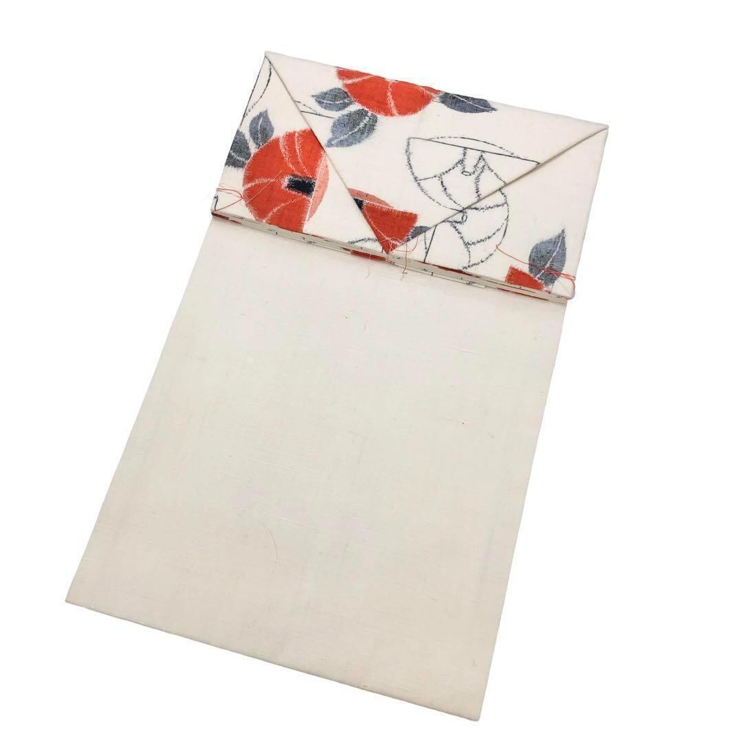 乳白色の紬地に抽象的な椿の花柄模様がデザインされた素敵な柄裄のお品でございます。