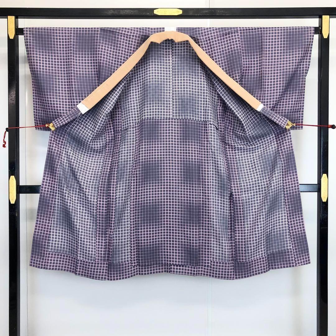 鳩羽色ベースのお色味、小さな格子柄の濃淡で大小の格子柄になるデザインが素敵な柄裄のお品でございます。