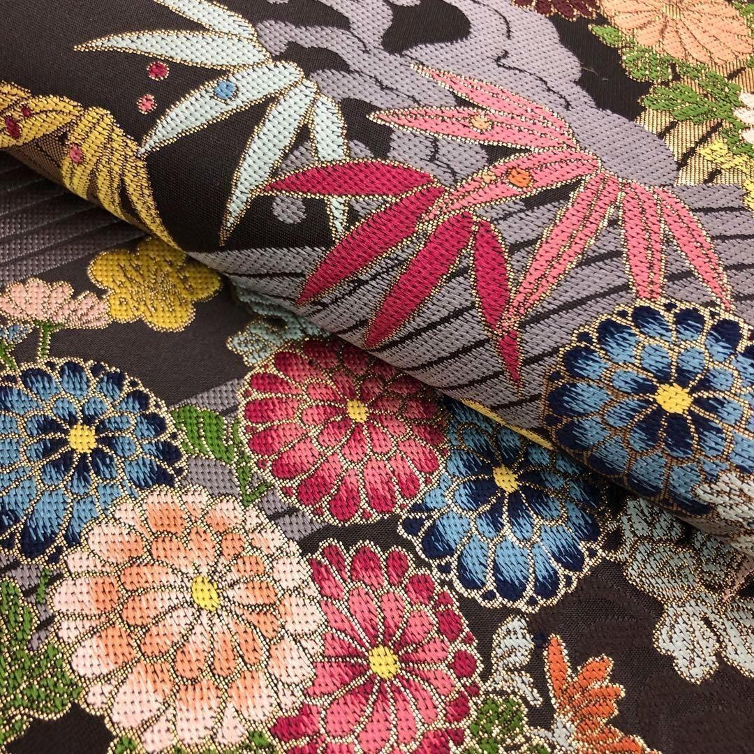 涅色の落ち着きのあるお色味に金糸が使われた流水に彩り鮮やかな菊、梅の花柄や笹の織模様がデザインされた素敵な柄裄のお品でございます。