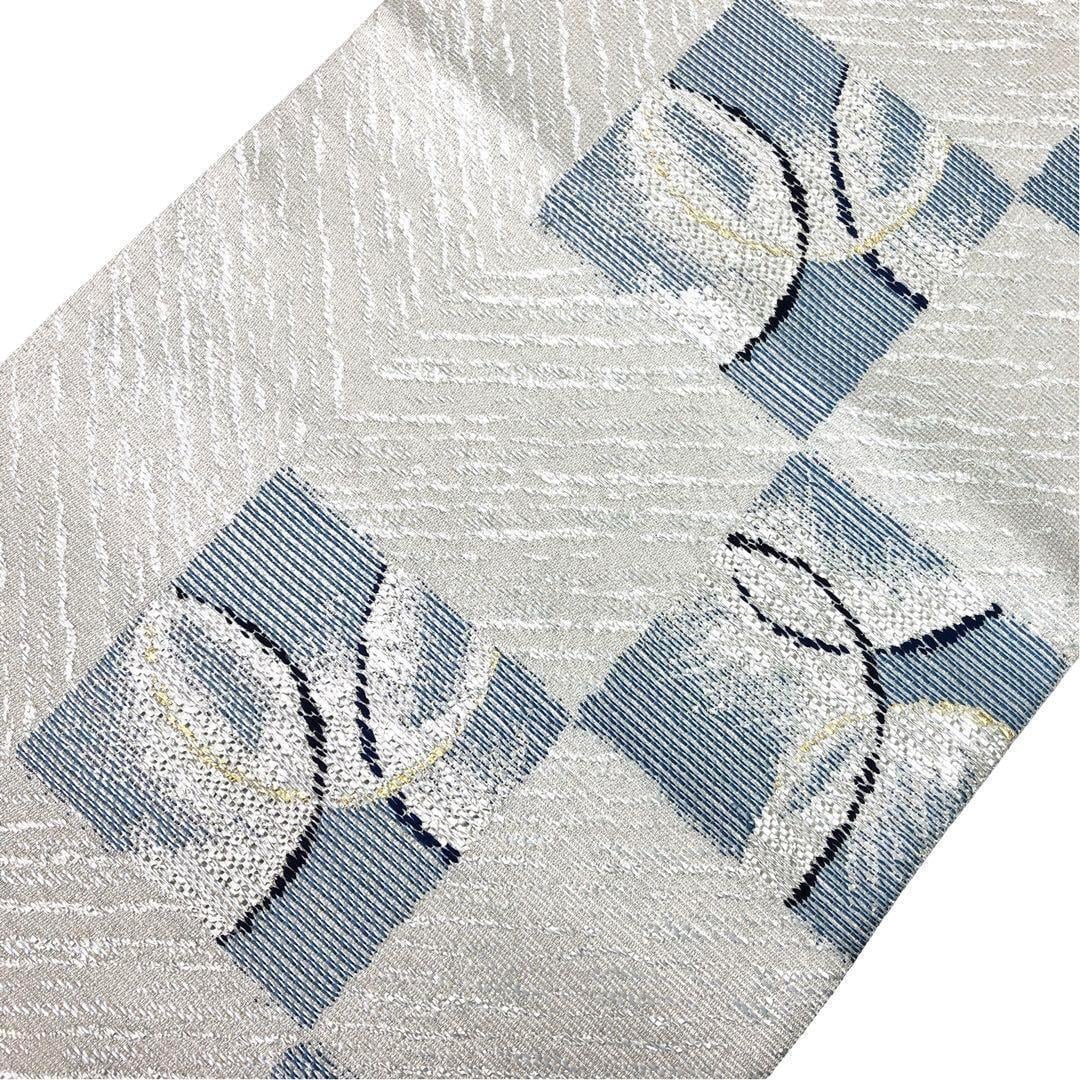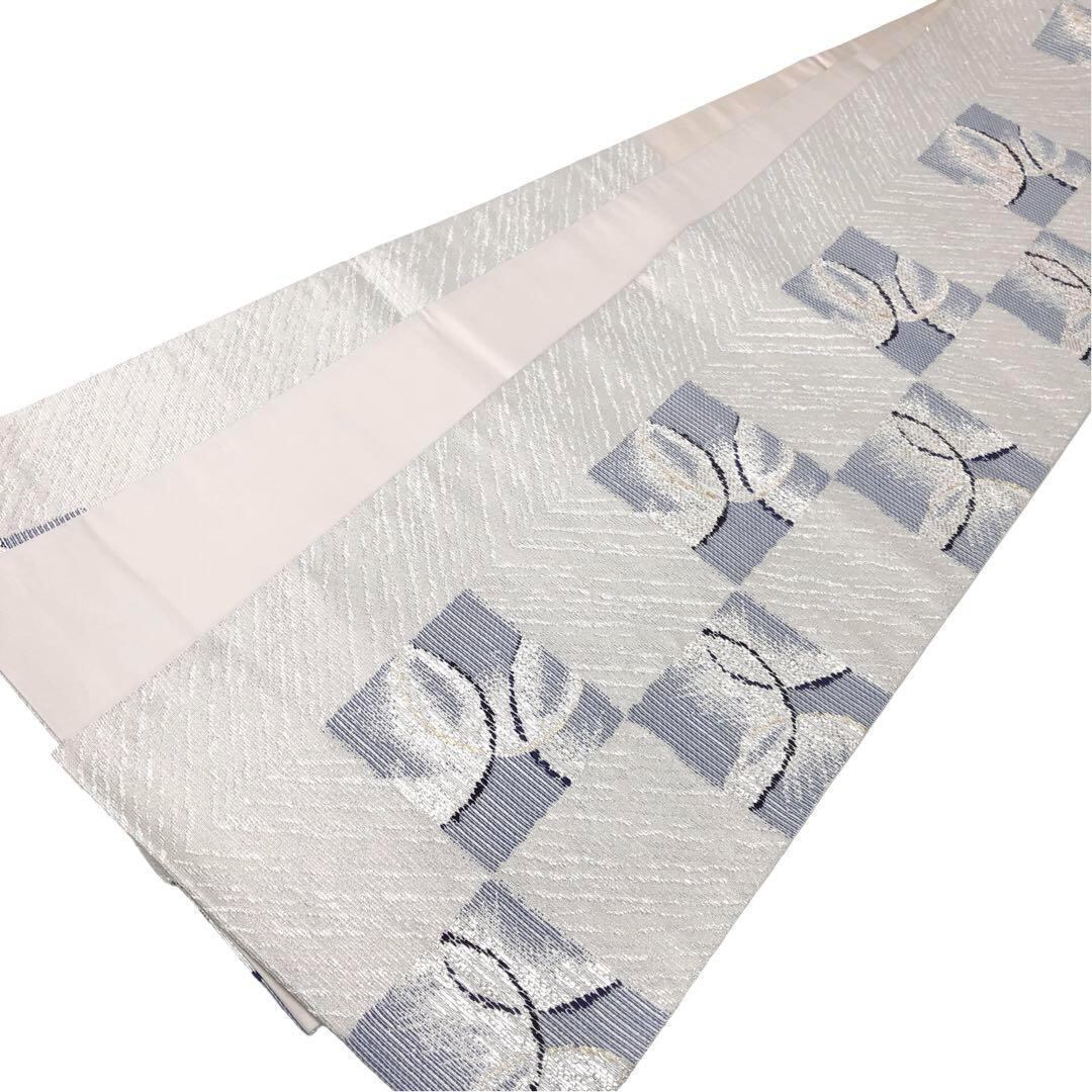 袋帯 上品な青味の四角柄模様 金銀糸 卯の花色 O-3603