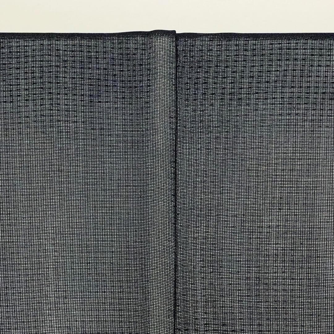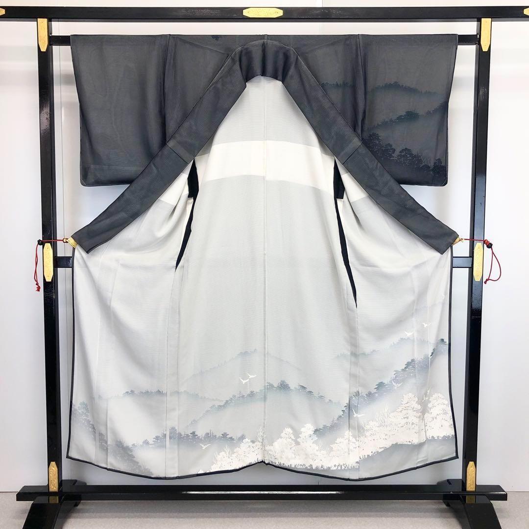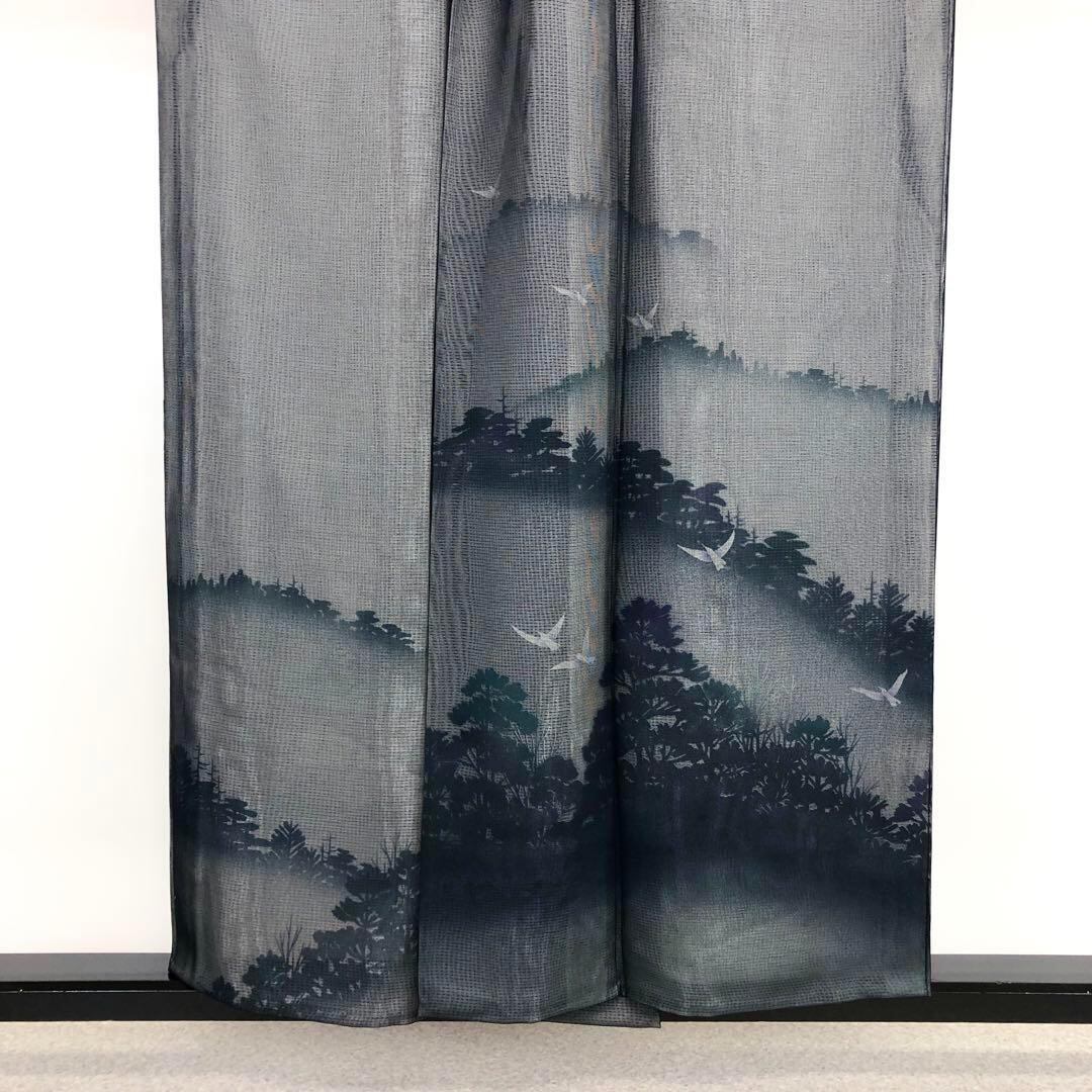 青褐色ベースの透け感のある生地、山々の風景に鳥が羽ばたく柄裄がデザインされた素敵な柄裄のお品でございます。