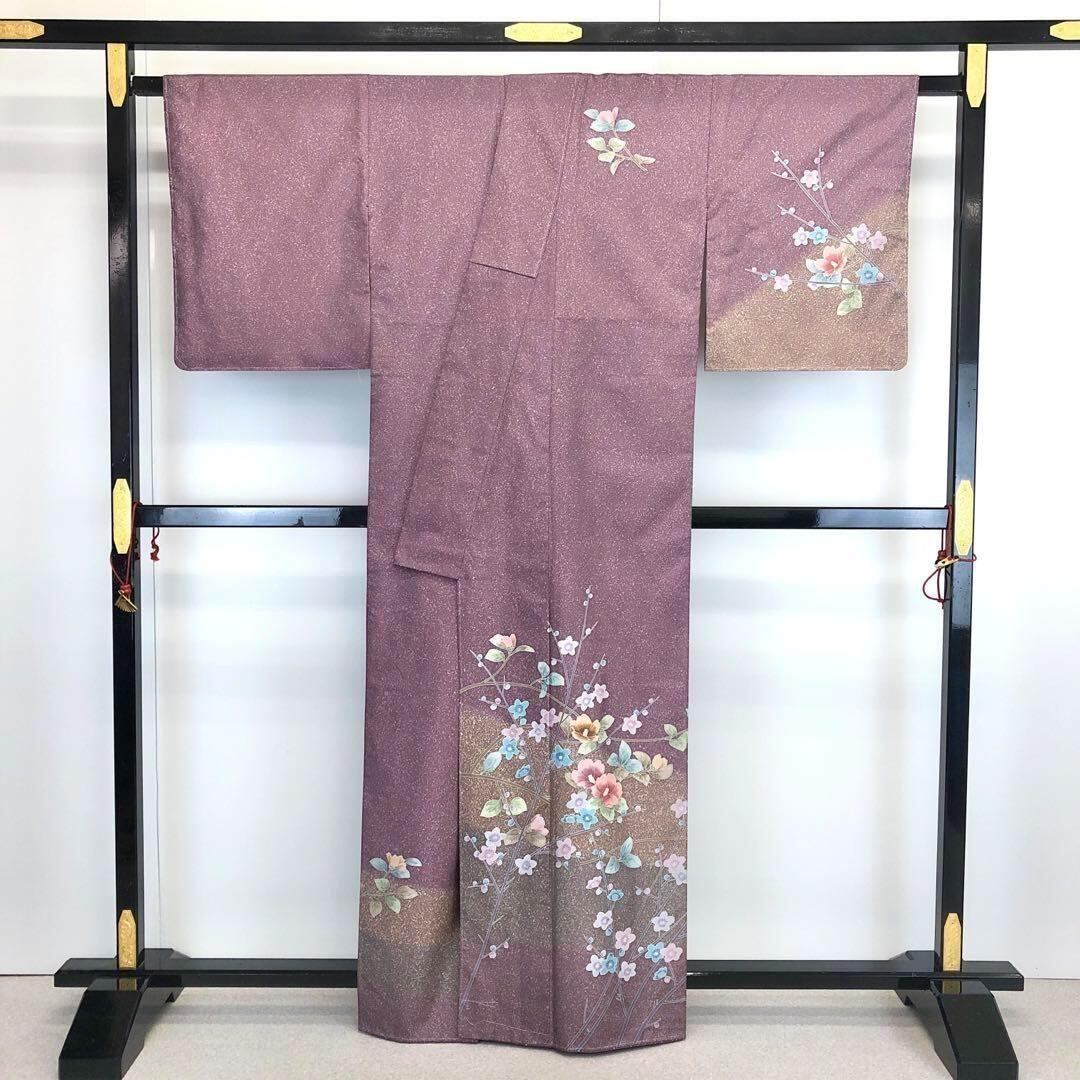 牡丹鼠色ベースの染大島に叩き染、鮮やかな花柄模様がデザインされた素敵な柄裄のお品でございます。