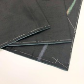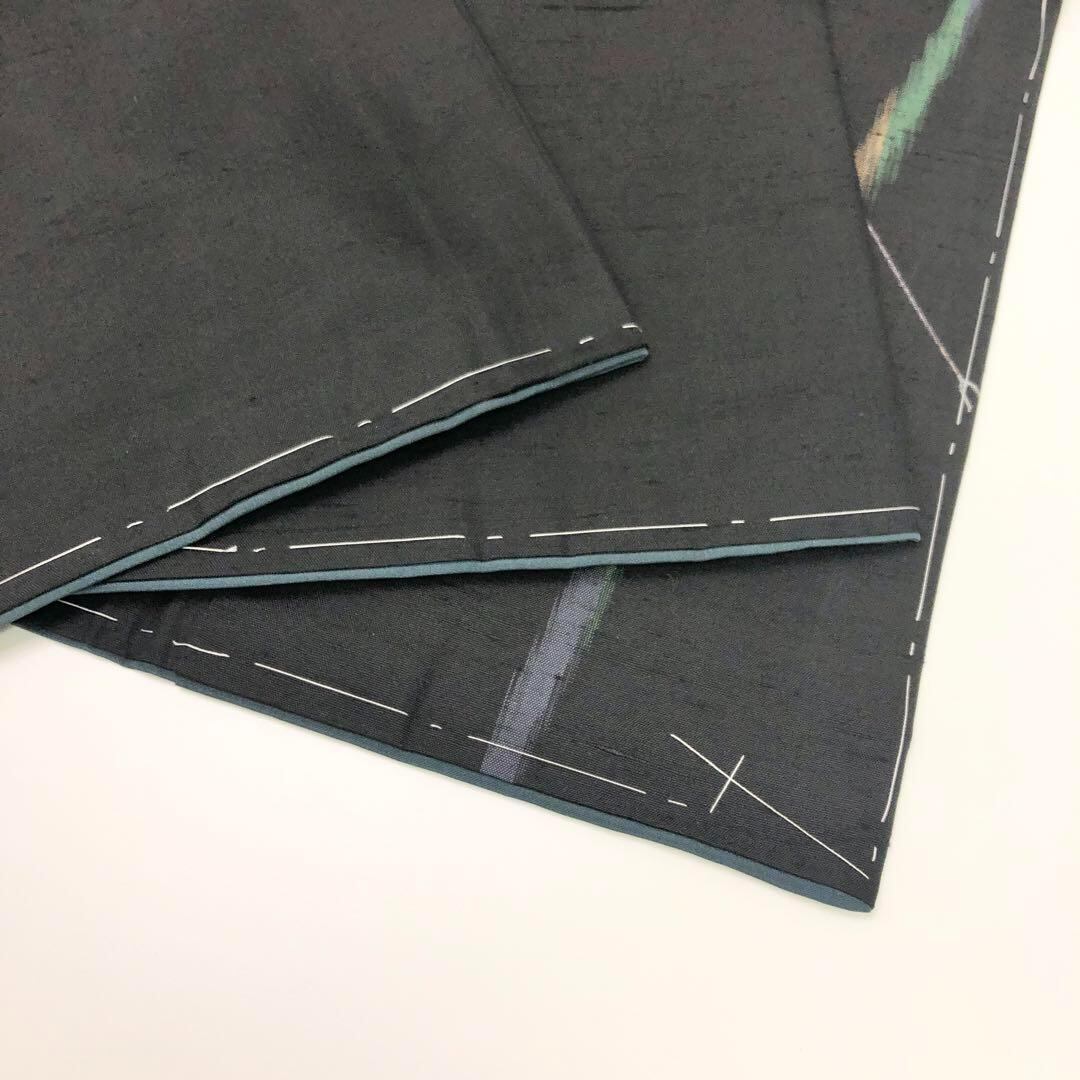 黒色の紬に縦柄のよれ縞模様に矢羽根の柄裄がデザインされた素敵な柄裄のお品でございます。