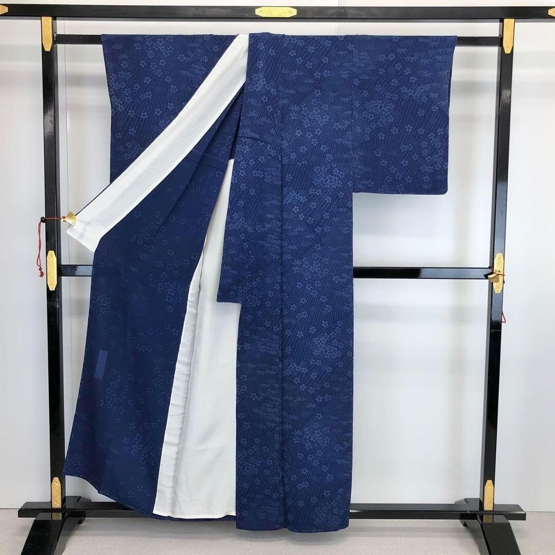 単衣 小紋 阿波藍染伝統工芸 金子正 梅竹模様 縮緬 K-3680 着物 きもの kimono 和服 和装 中古 リサイクル着物 【送料無料】