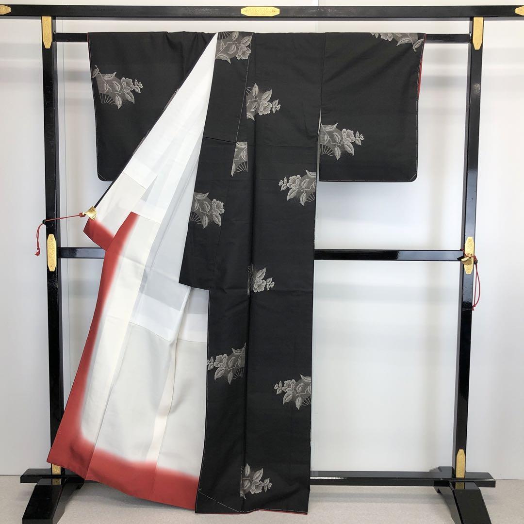 純泥染の地空き、黒色ベースのお色味に扇子に花模様がデザインされた素敵な柄裄のお品でございます。