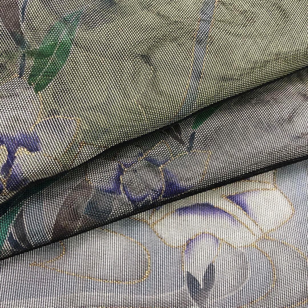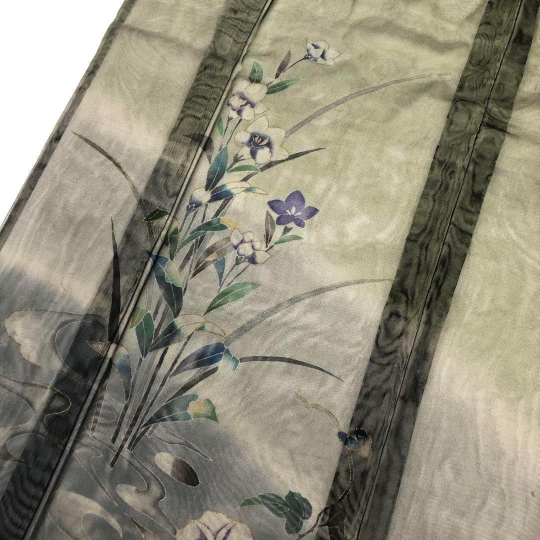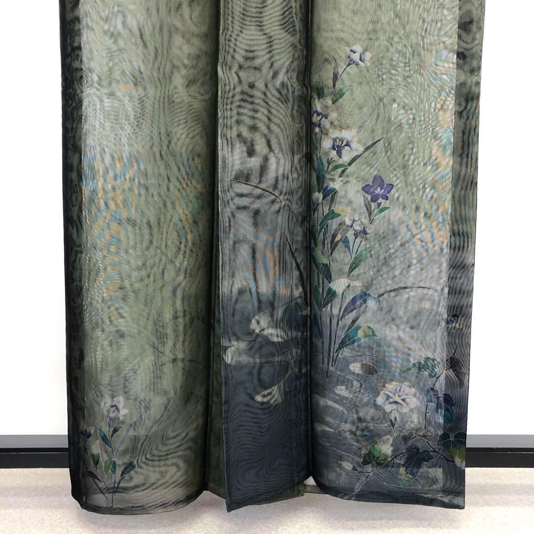 透け感のある鈍色ベースのお色味に暈し、竜胆、朝顔などの上品な花模様がデザインされた涼しげな雰囲気の素敵な柄裄のお品でございます。