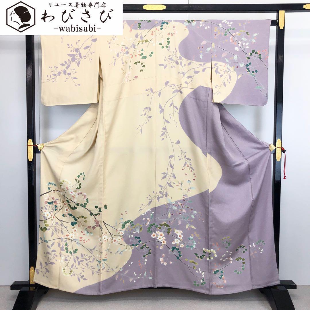 薄黄色と藤色の二色の色彩の縮緬に手描き友禅の美しい枝花模様がデザインされた素敵な柄裄のお品でございます。