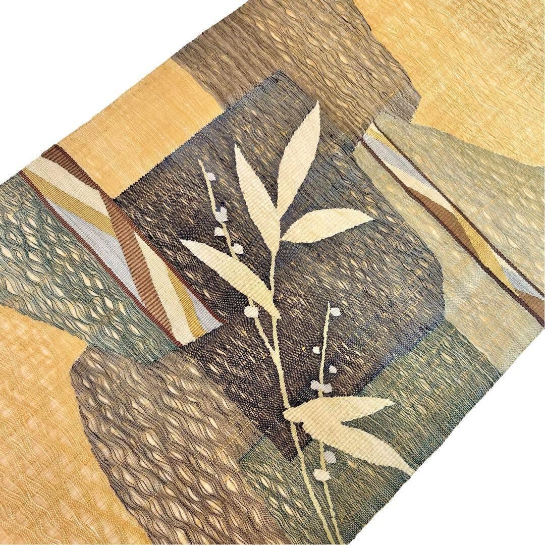 玉蜀黍色のお色味に透け感のあるすくい織、枝葉の織模様がデザインされた素敵なお品でございます。