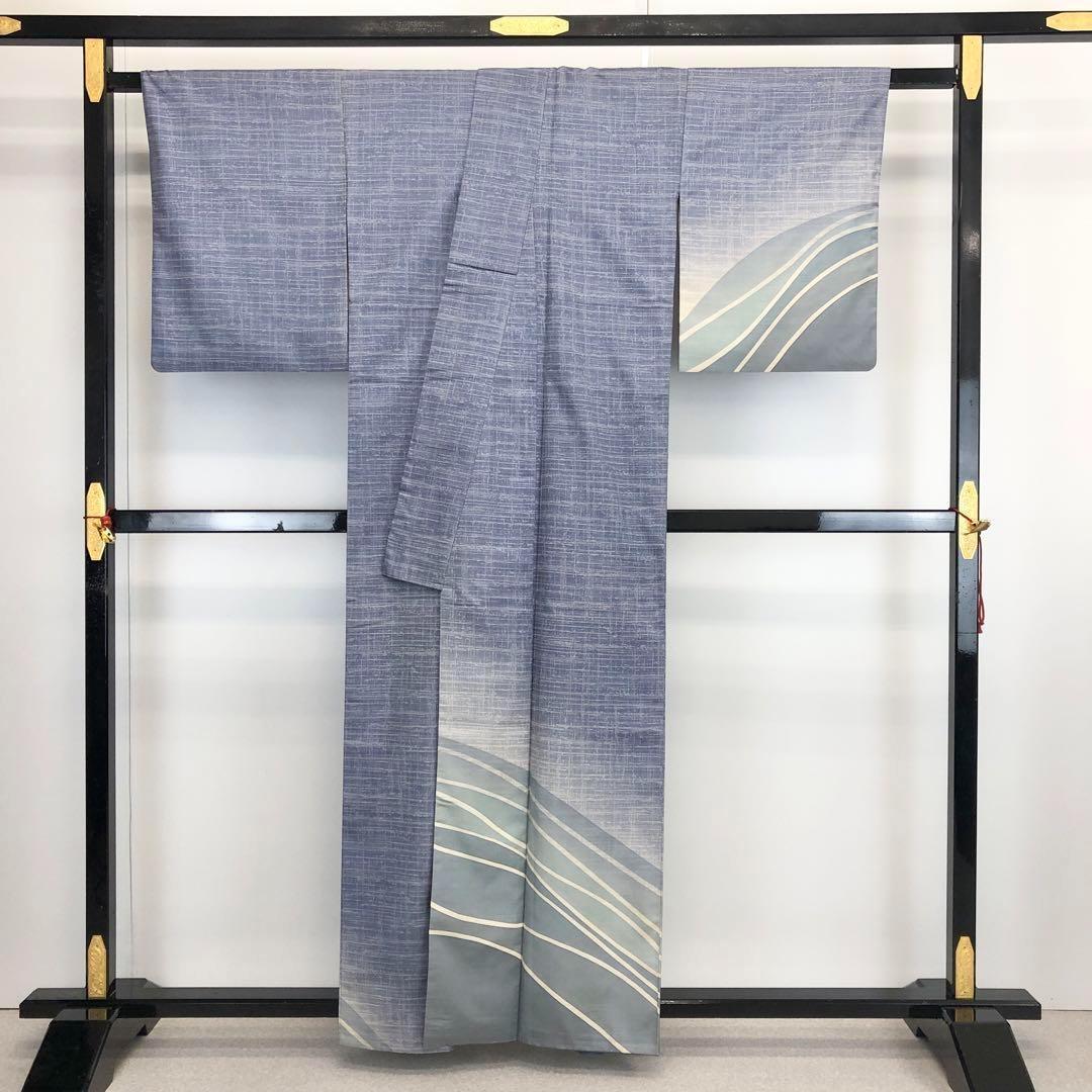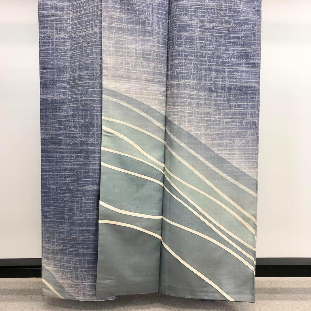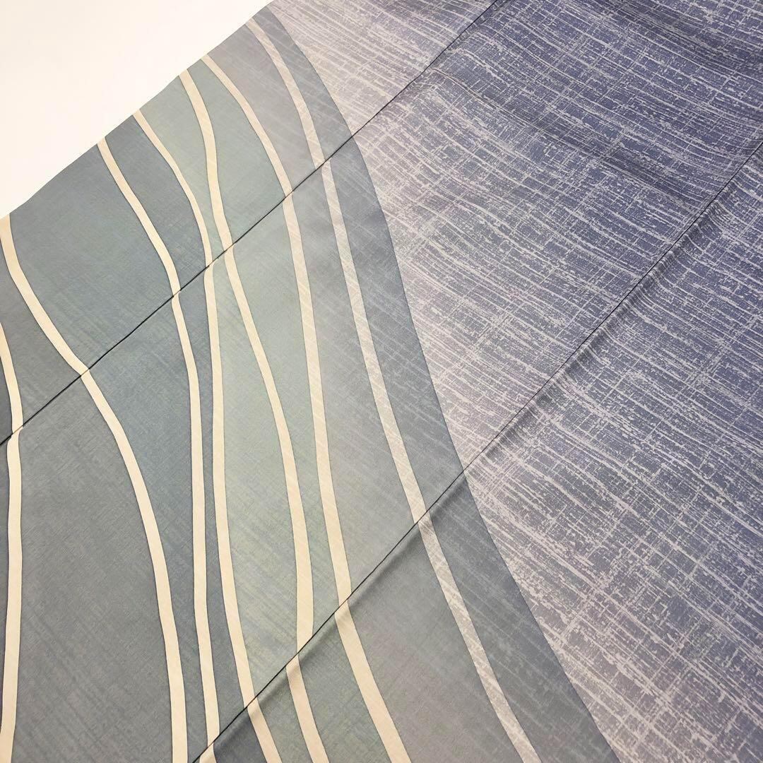 青袋鼠色ベースの染大島、色味の良い青系のお色味にグラデーション、曲線抽象柄の素敵なお品でございます。