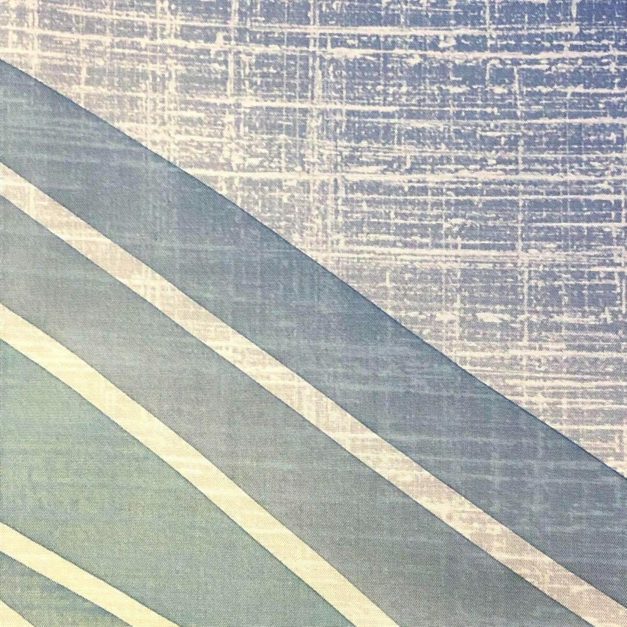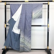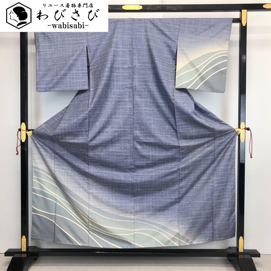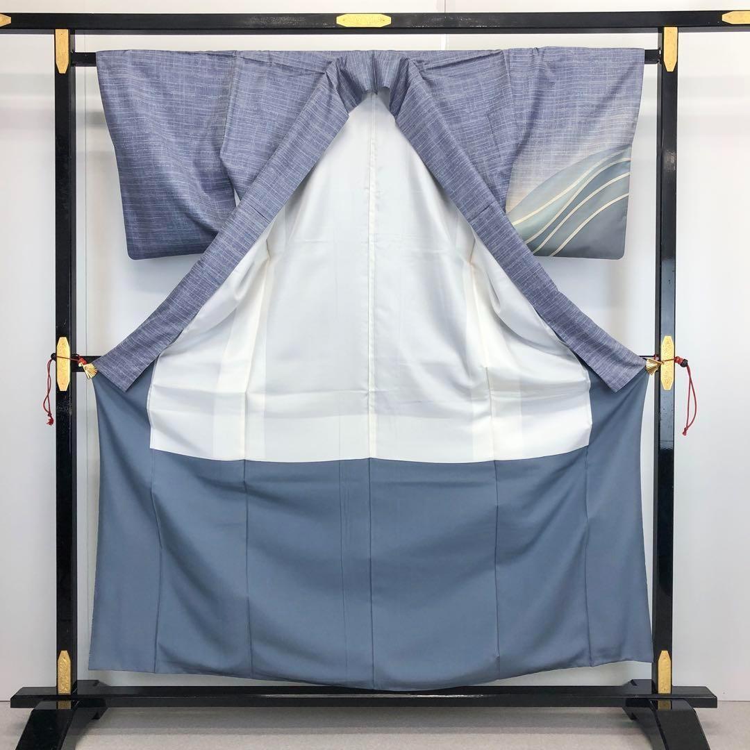 青袋鼠色ベースの染大島、色味の良い青系のお色味にグラデーション、曲線抽象柄の素敵なお品でございます。