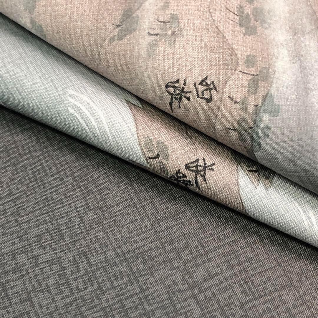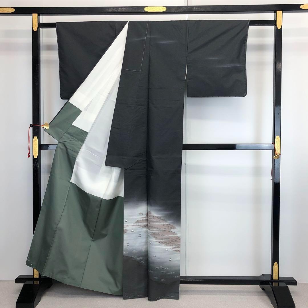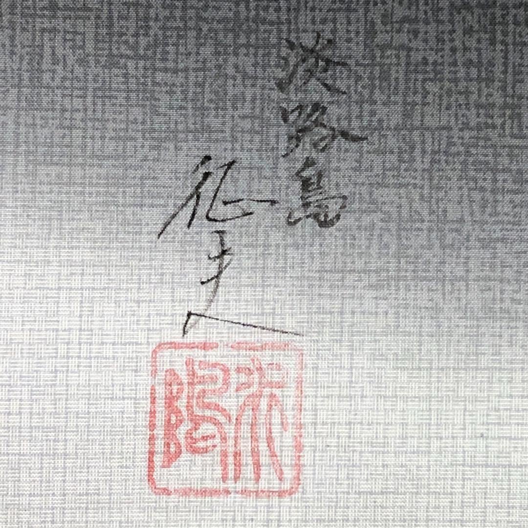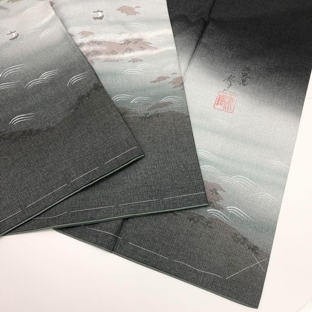墨色ベースの暈しの染大島、手描きでデザインされた淡路島の風景柄が素敵なお品でございます。
