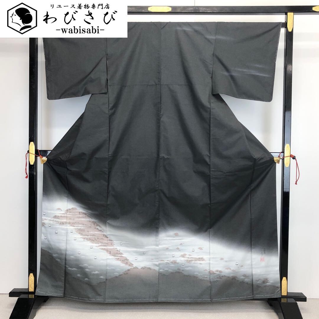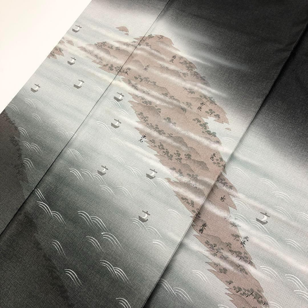 訪問着 染大島 作家物 淡路島の風景柄 墨色 しつけ糸 K-3696 着物 きもの kimono 和服 和装 中古 リサイクル着物 【送料無料】