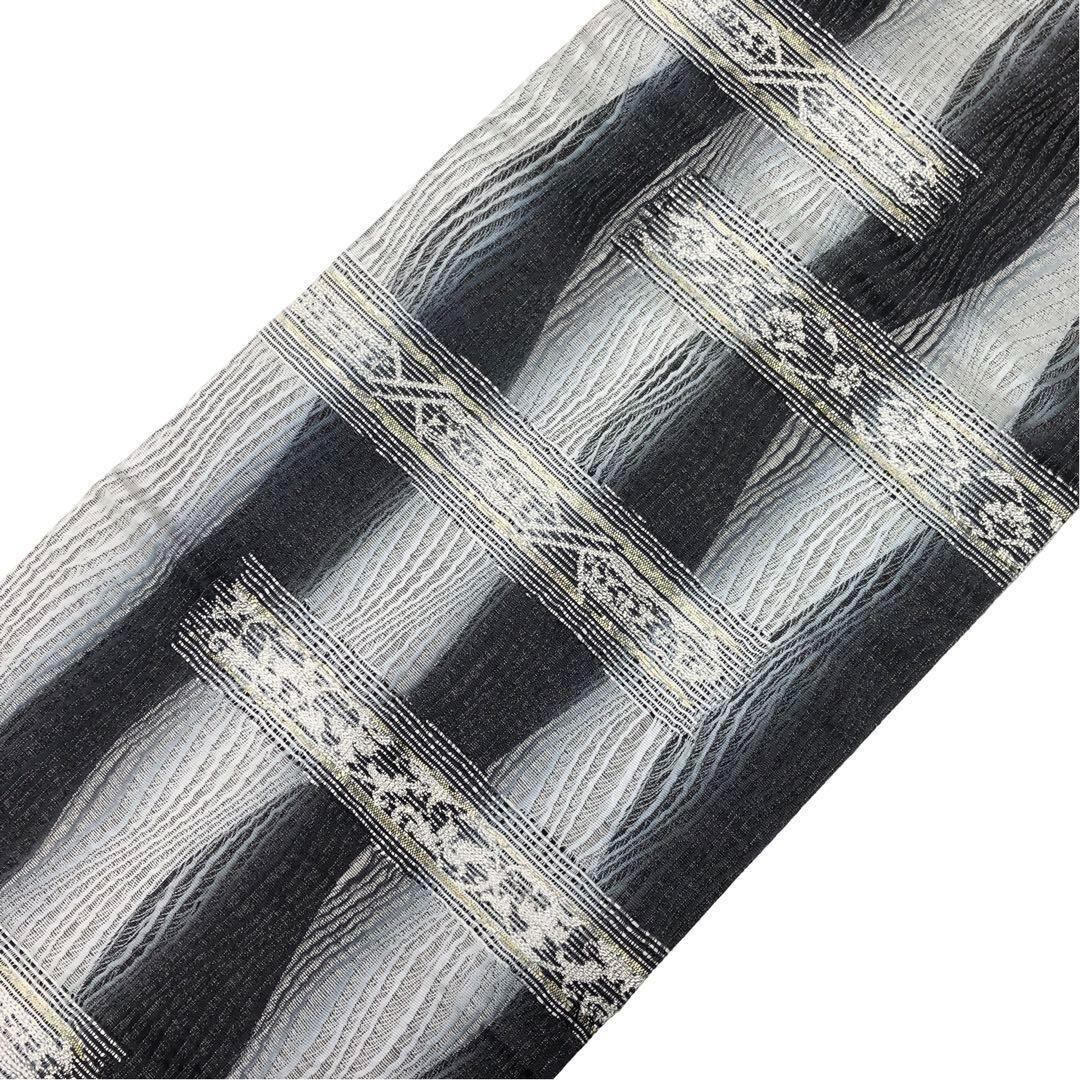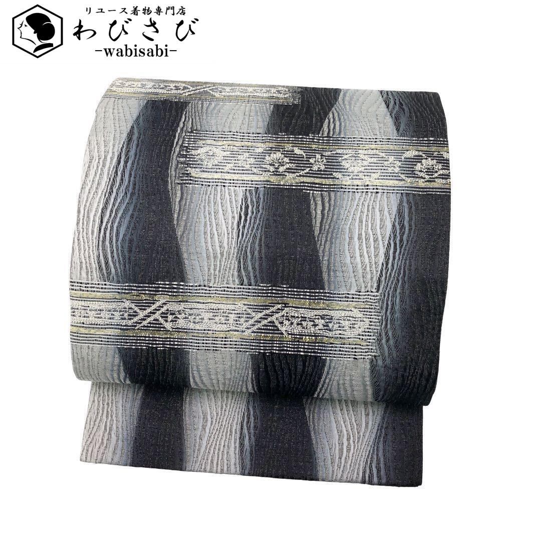 袋帯 リバーシブル 横段花柄模様 モノトーン O-3605 着物 きもの kimono 和服 和装 中古 リサイクル着物 【送料無料】