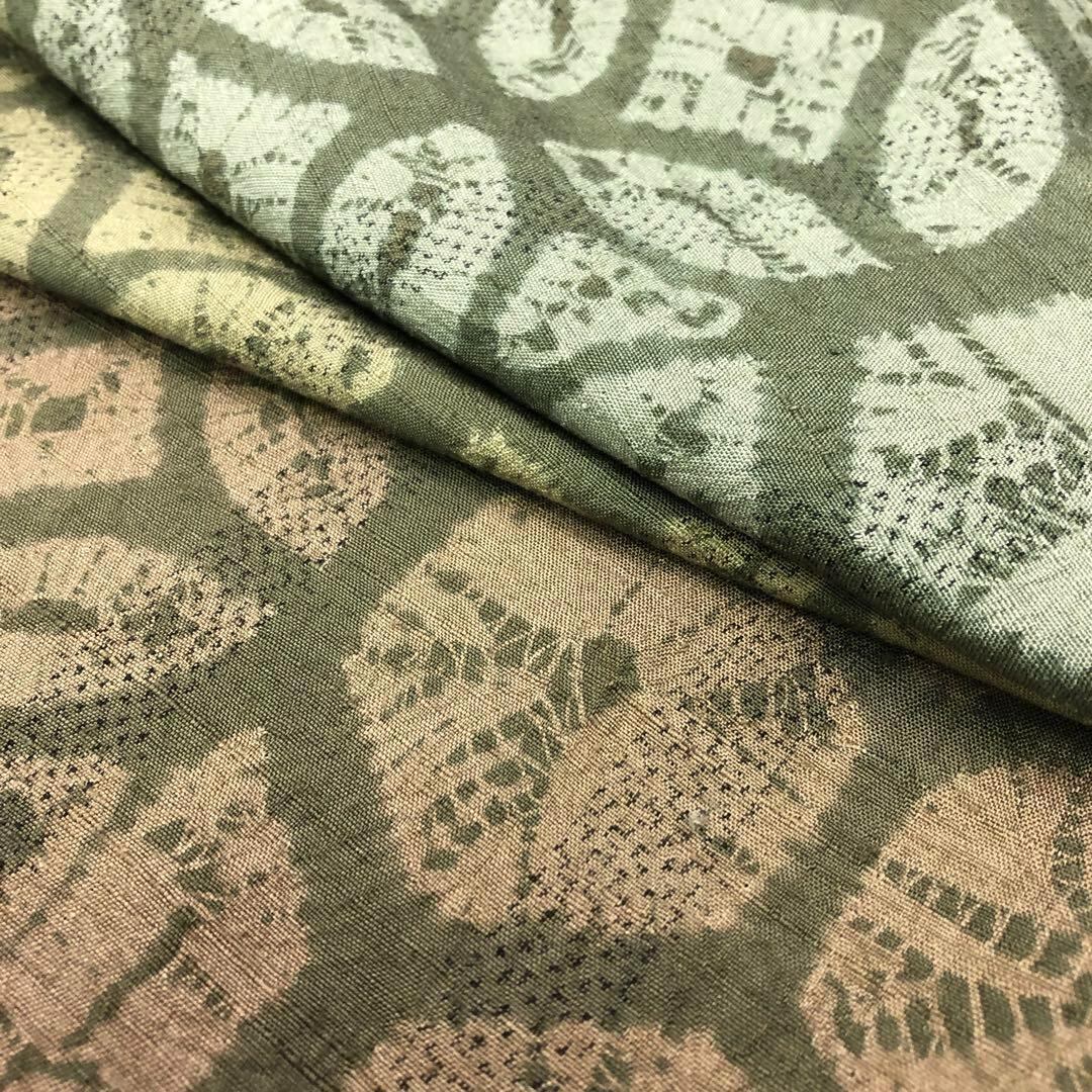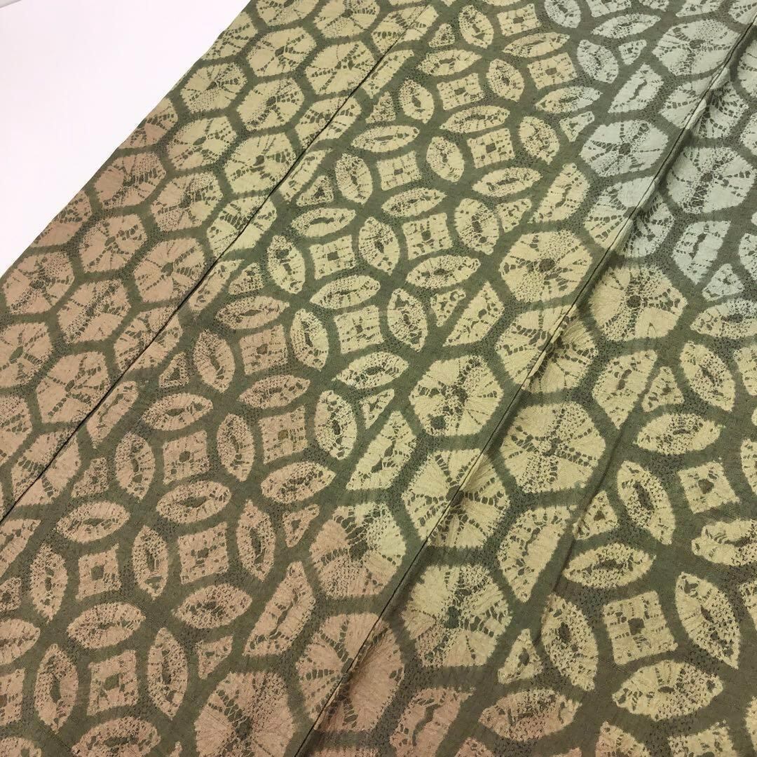 蜘蛛絞りの雰囲気の良い絞り柄、七宝繋ぎ、亀甲などの柄裄に染分けの三色の淡い色味の良い素敵な柄裄のお品でございます。
