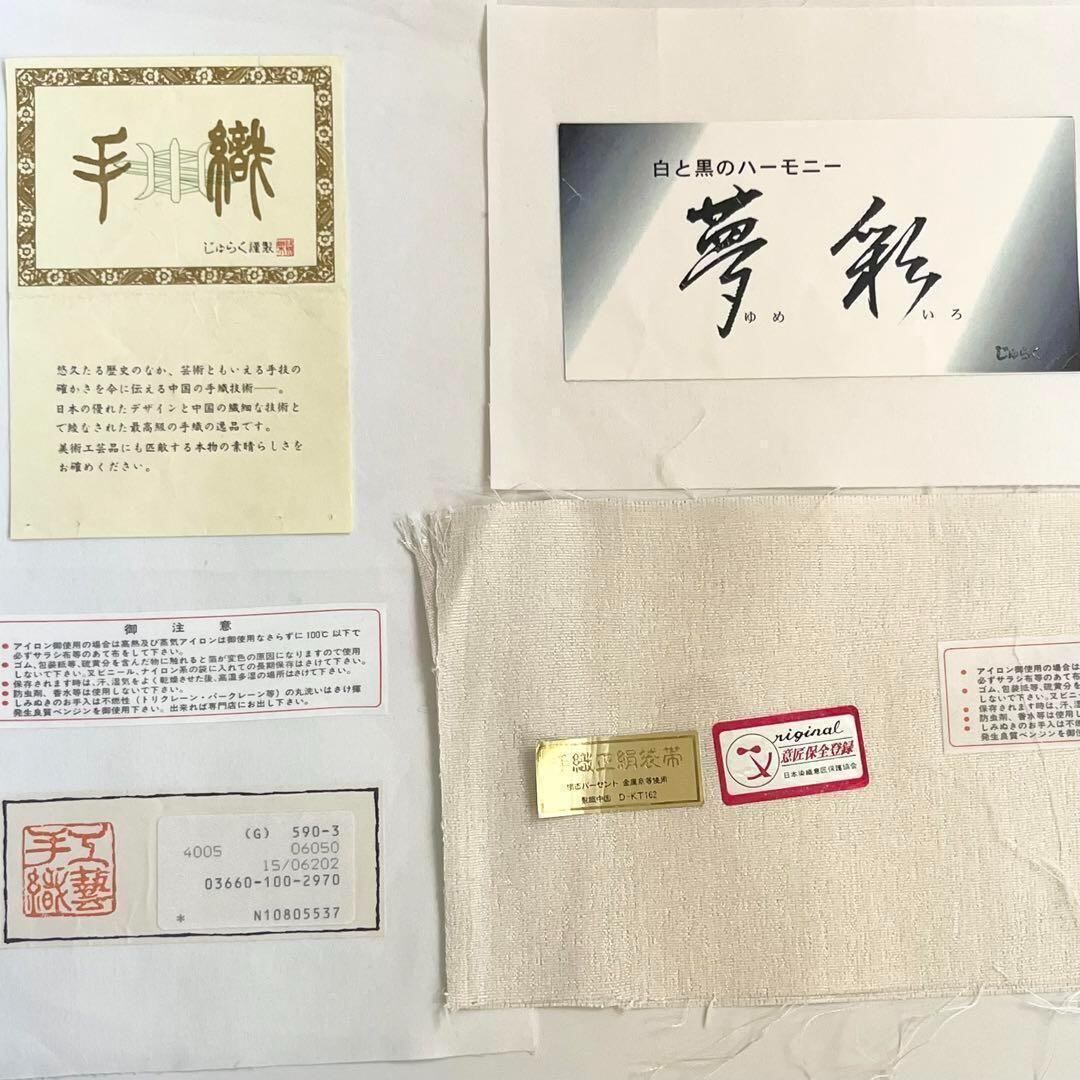 乳白色の上品なお色味、白と黒のハーモニー夢彩と題された品のある抽象模様がデザインされた手織りの素敵なお品でございます。