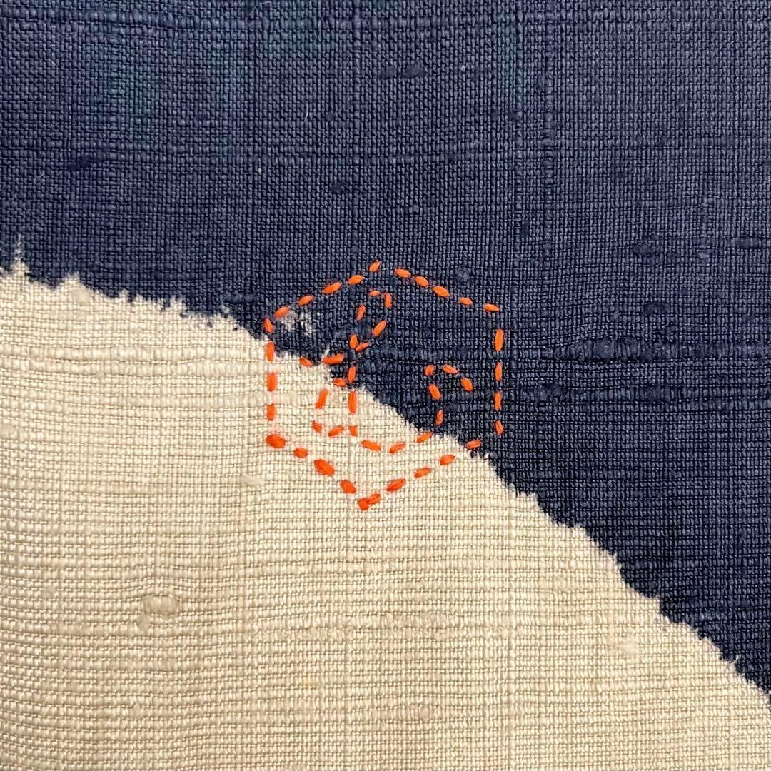 紺鉄色の染め色ベースの紬に刺し子の花草模様がデザインされた雰囲気の良い素敵な柄裄のお品でございます。