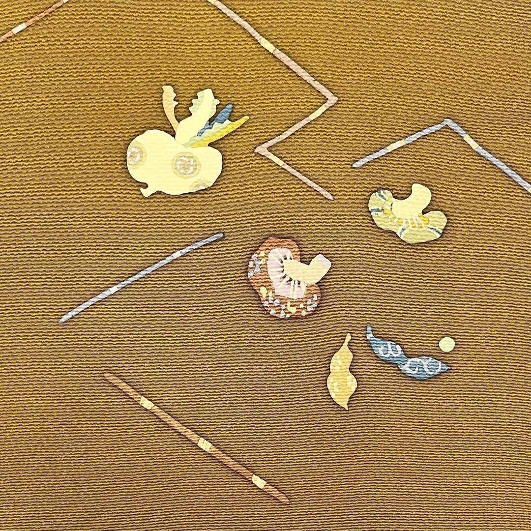 落ち着きのある路考茶色のお色の縮緬にお洒落な野菜柄がデザインされた素敵な柄裄のお品でございます。