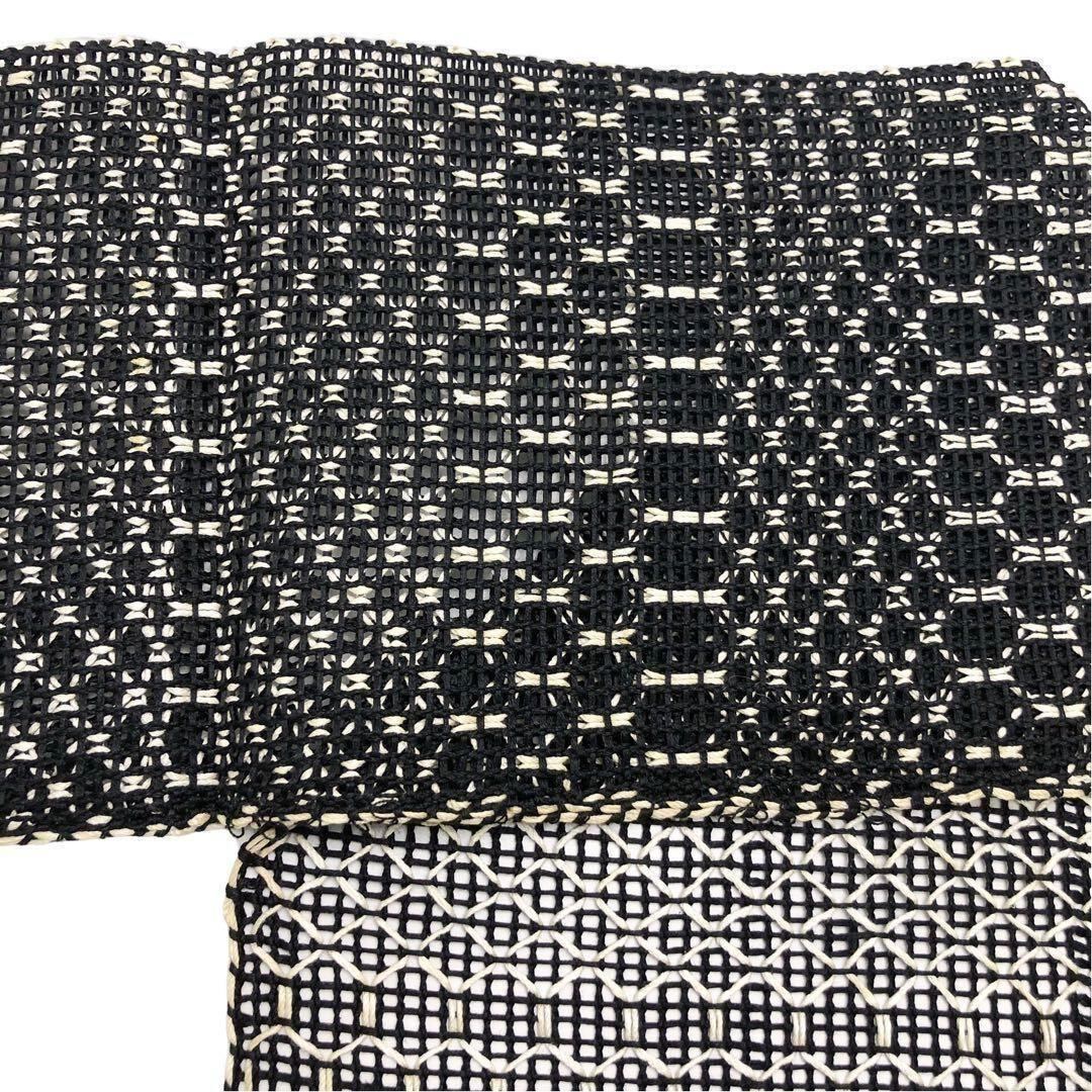黒色ベースのお色に三角のモダンな透け感のある織模様がデザインされた素敵な柄裄のお品でございます。