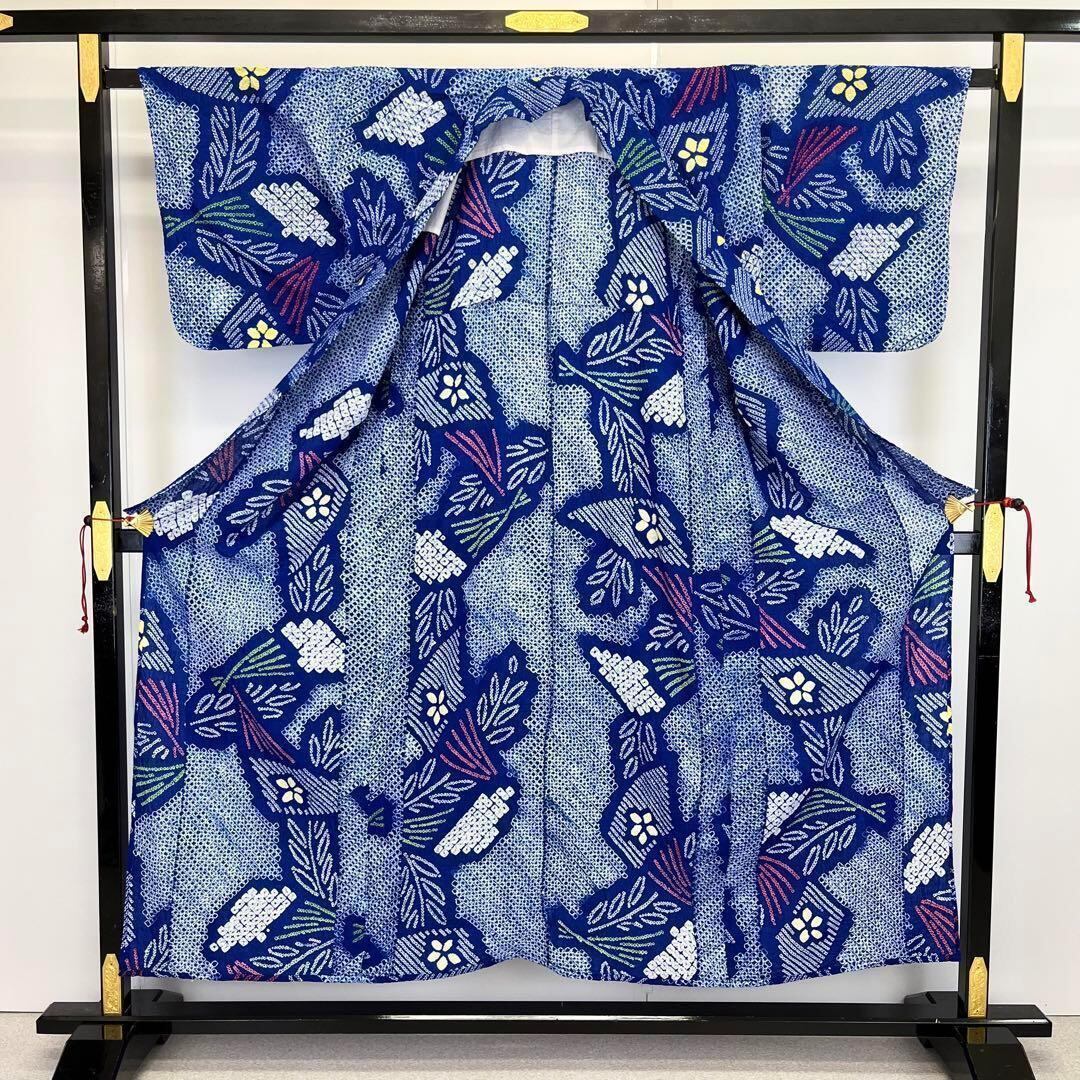 瑠璃色ベースの美しい青味、扇子に花柄模様がデザインされた素敵な柄裄のお品でございます。