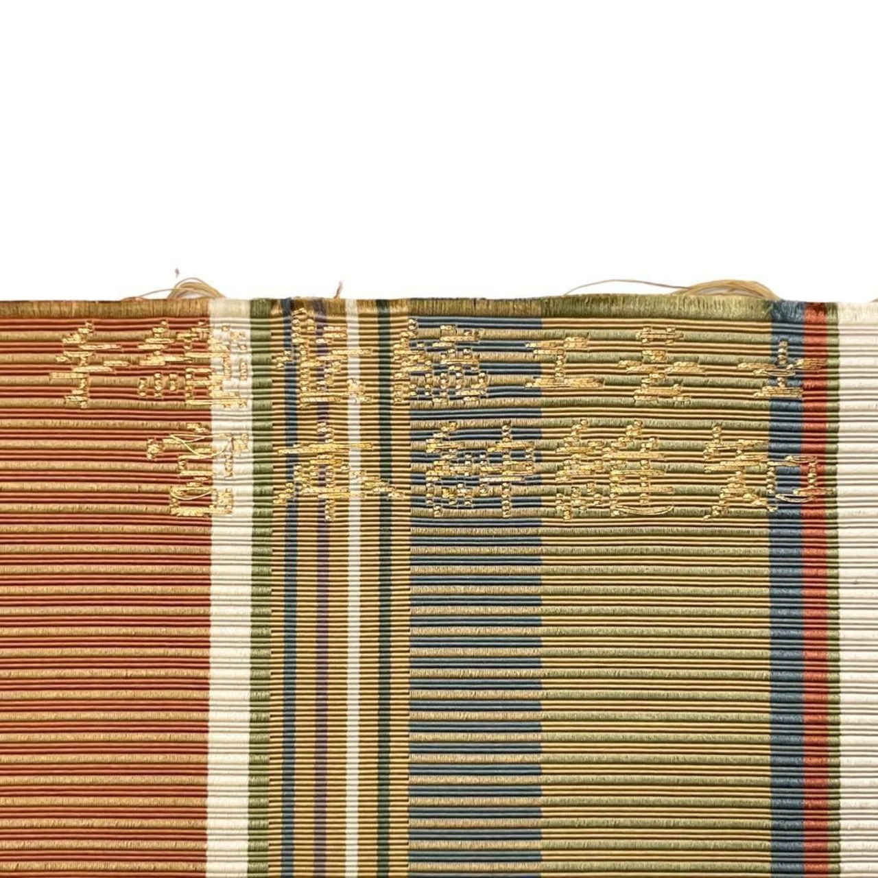幹色ベースの落ち着きのある色彩、手織伝統工芸士、宮本紳維知による絹鳴りのする美しい縦柄の唐草間道の柄裄が素敵なお品でございます。