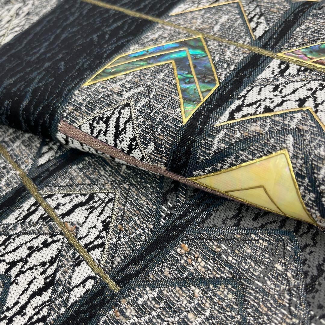 モノトーンベースのお色にモダンな縦柄模様、美しい螺鈿細工でデザインされた素敵な柄裄のお品でございます。