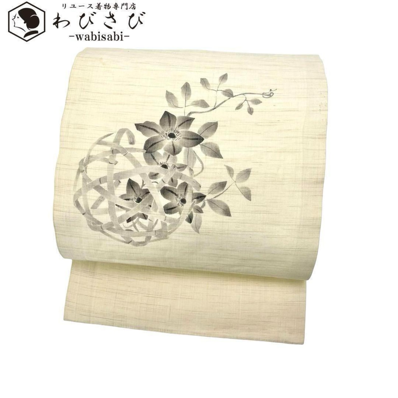 夏帯 名古屋帯 手描き 墨描き 麻 丸い花籠に花模様 鳥の子色 O-3704 着物 きもの kimono 和服 和装 中古 リサイクル着物 【送料無料】