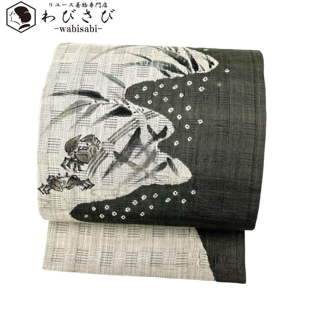 夏帯 名古屋帯 麻 手描き 墨描き 水辺の蟹 灰白色 O-3678