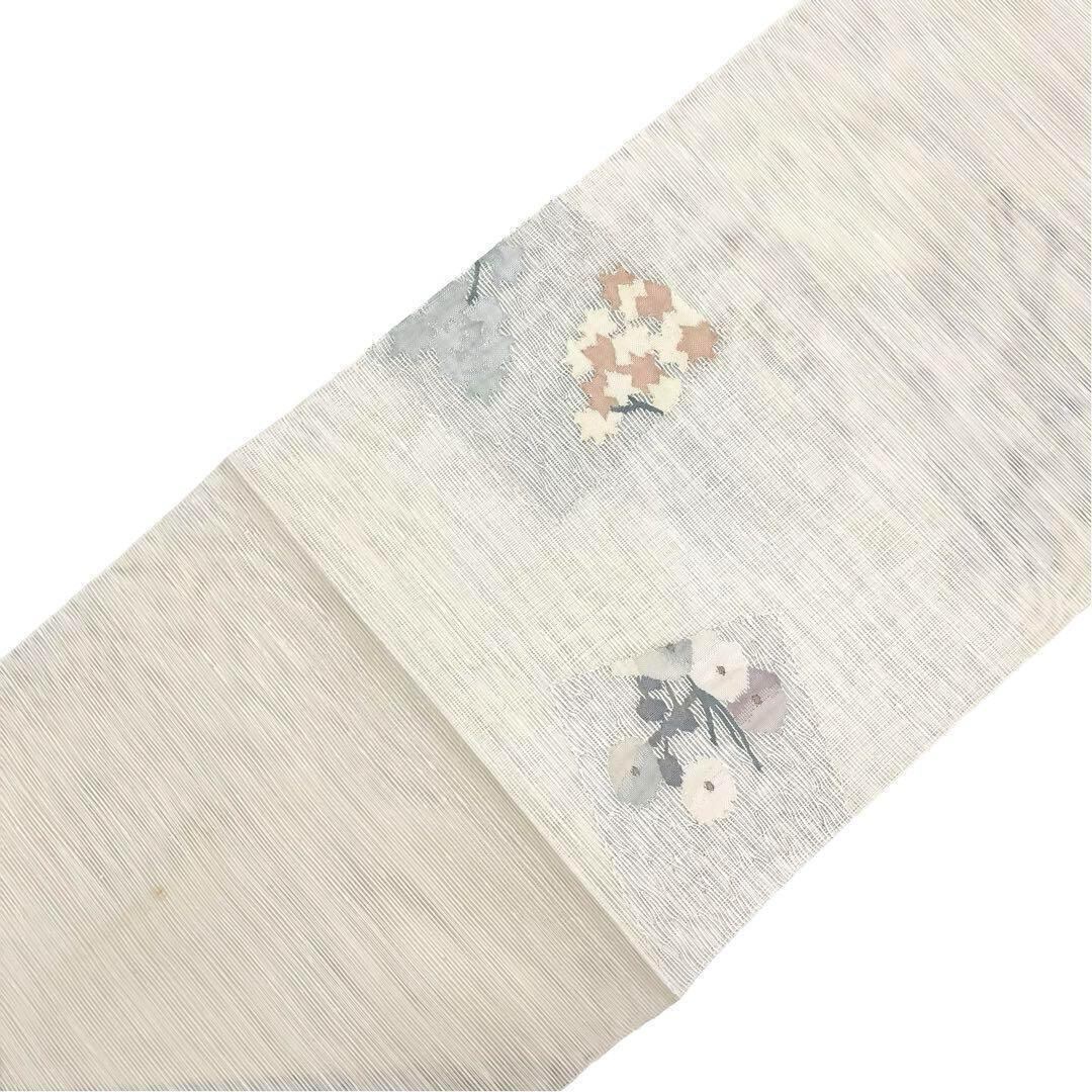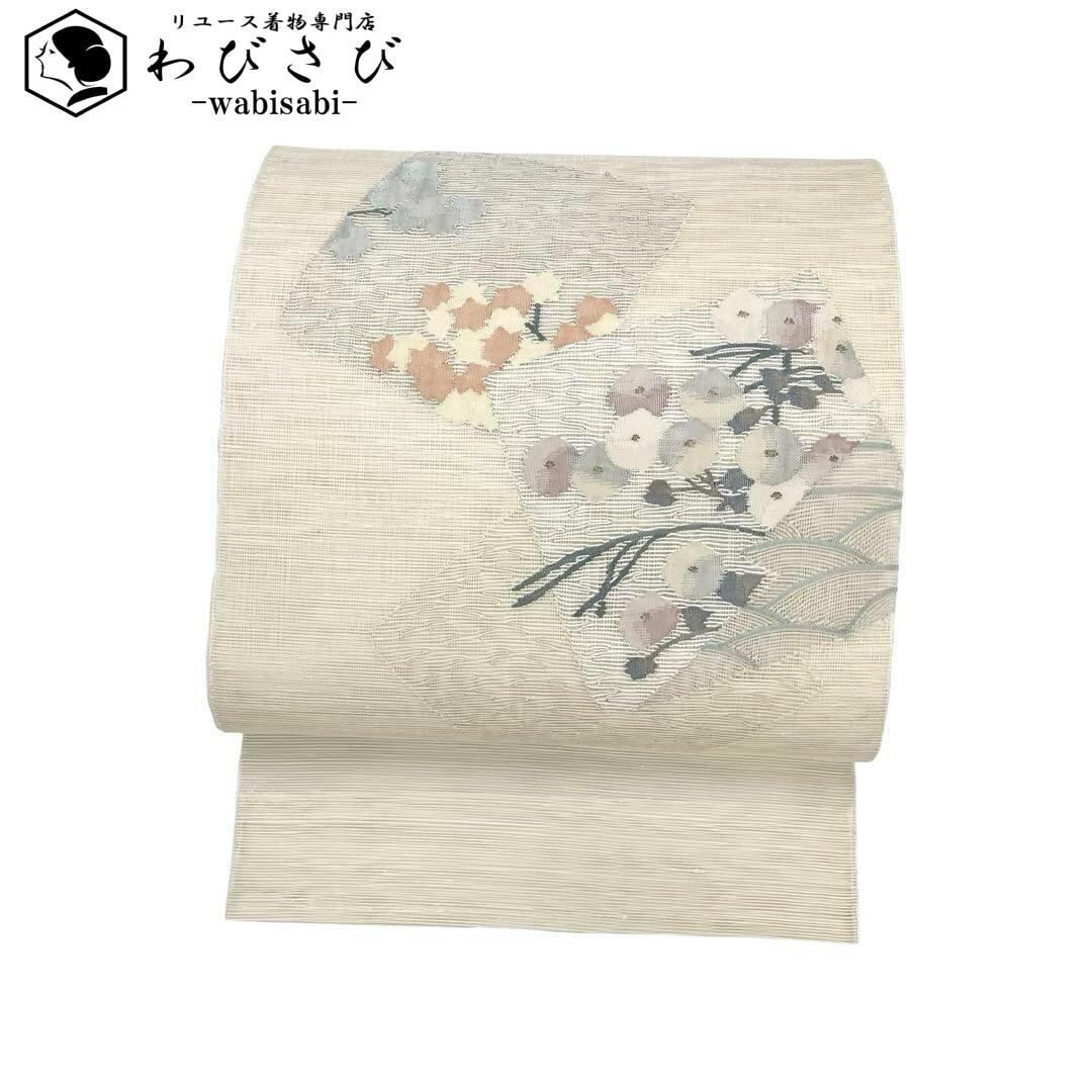 夏帯 袋帯 紗紬 色紙に万寿菊と紅葉 銀糸 鳥の子色 O-3694 着物 きもの kimono 和服 和装 中古 リサイクル着物 【送料無料】