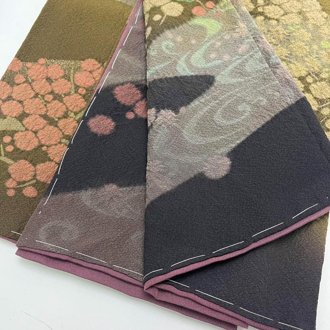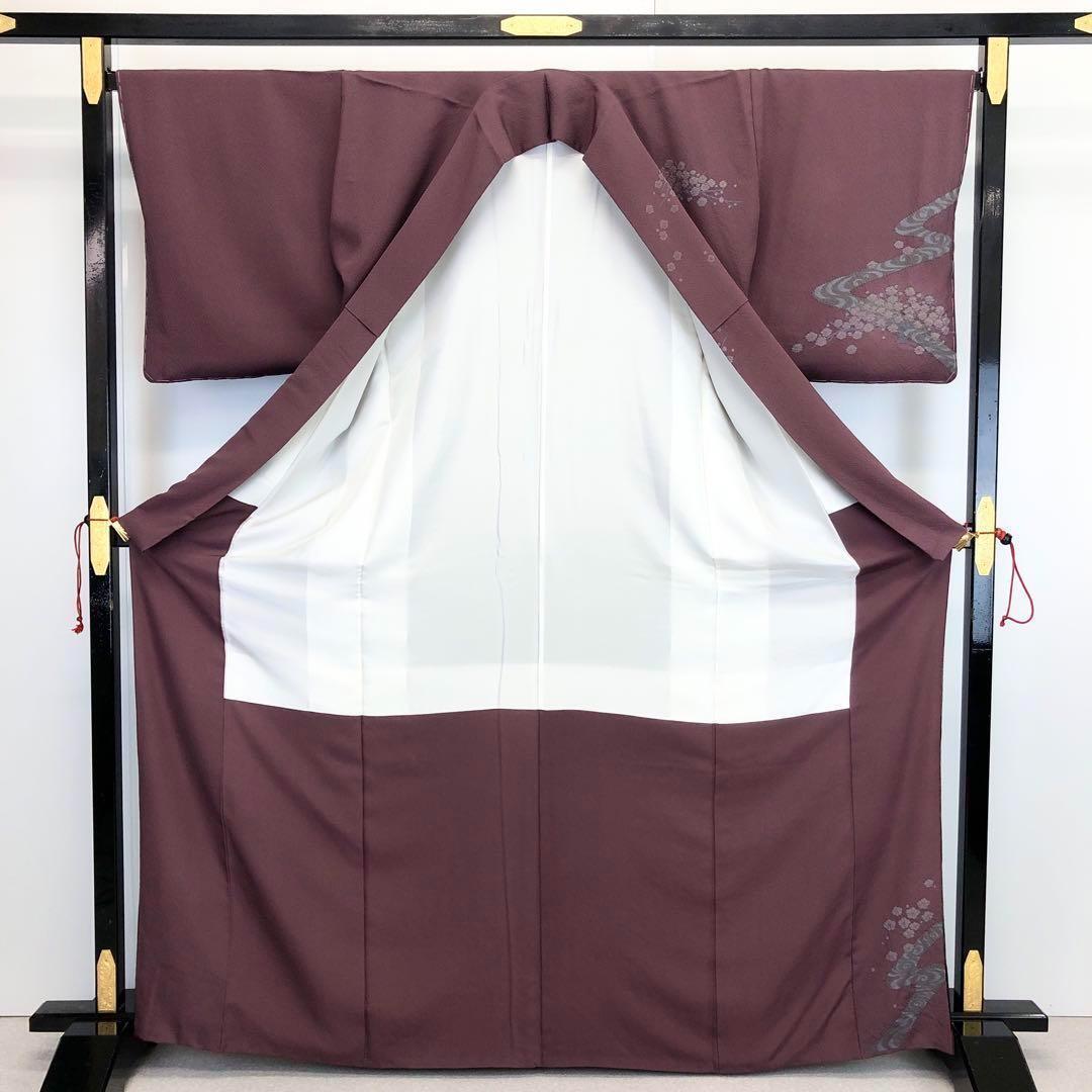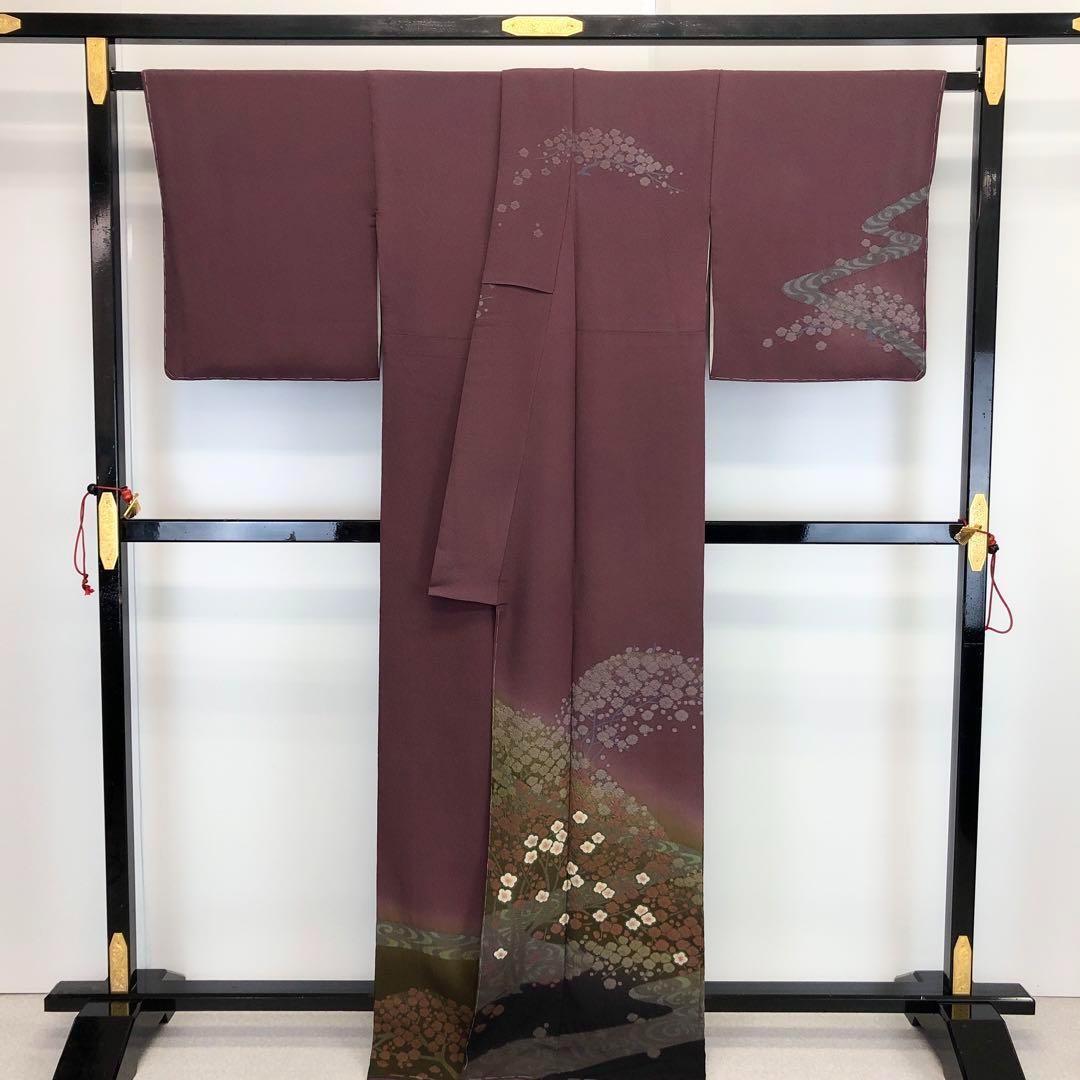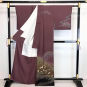 紫檀色の落ち着きのある色味の縮緬地に金彩が使われた絞り染めの美しい花模様がデザインされた雰囲気の良い素敵な柄裄のお品でございます。