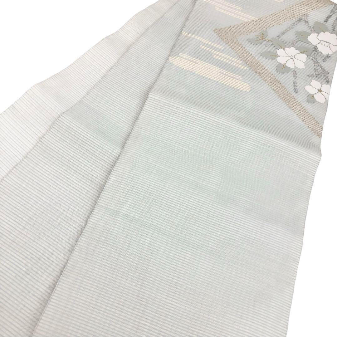 青白磁色の上品なお色味に霞模様に白い花柄がデザインされた素敵な柄裄のお品でございます。