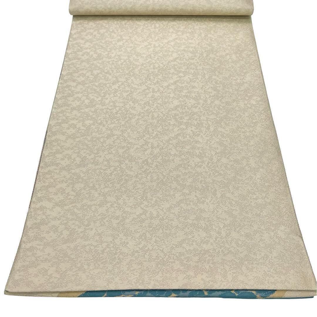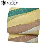 麦藁色ベースのお色、紹巴織でデザインされた抽象模様の柄裄が素敵なお品でございます。