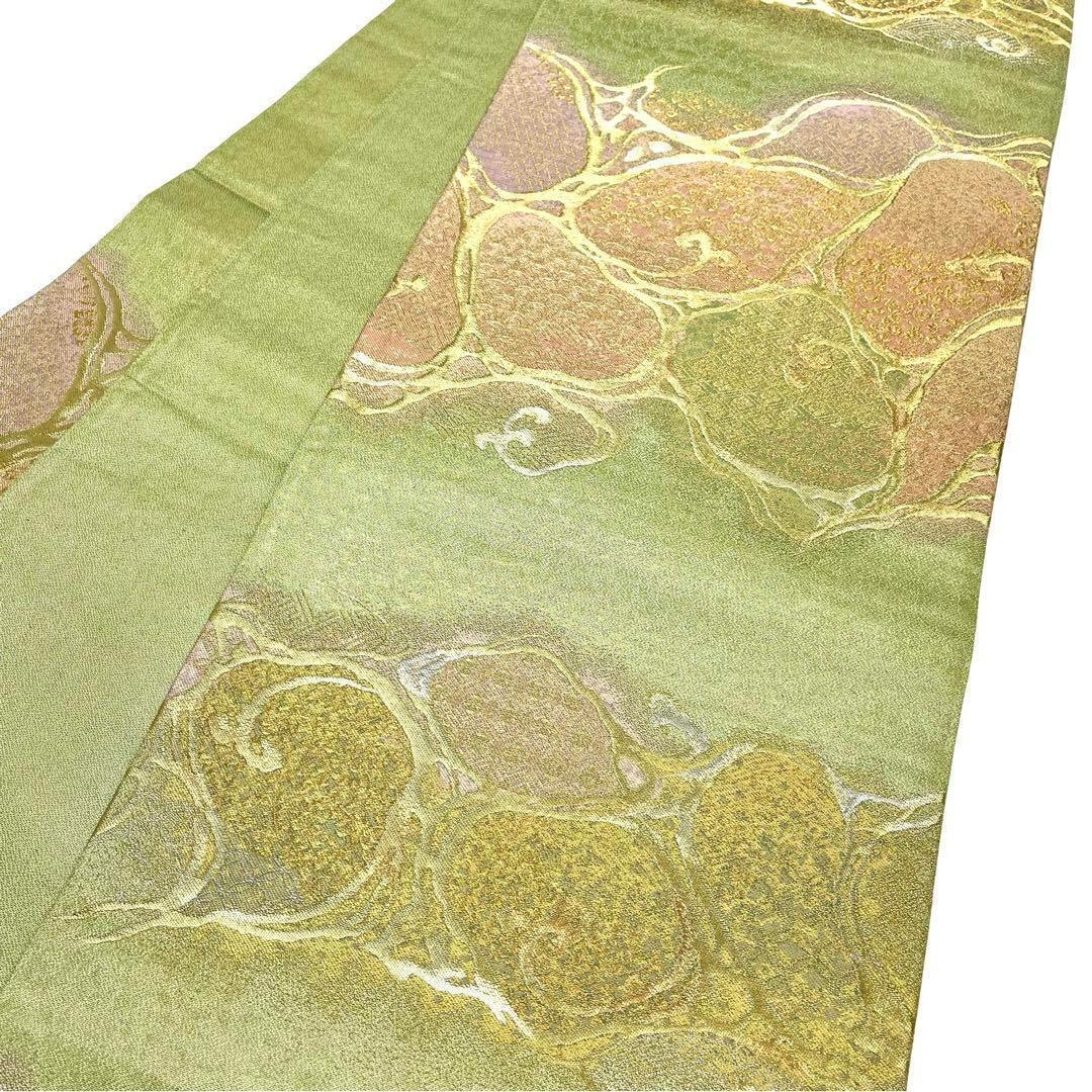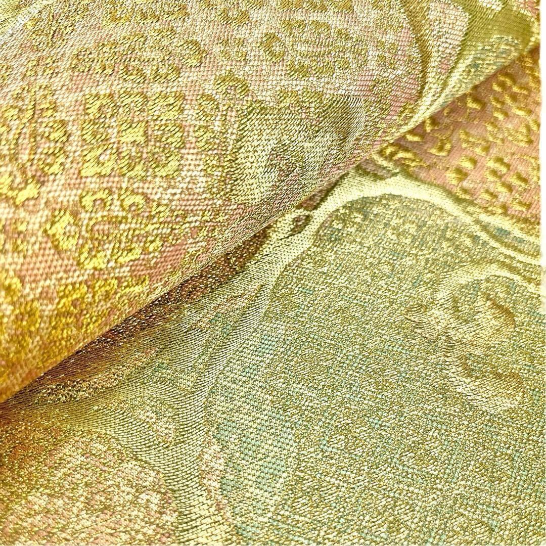 浅藍色ベースのお色味に金銀糸が使われた抽象織模様の中に多様な文様がデザインされた素敵な柄裄のお品でございます。