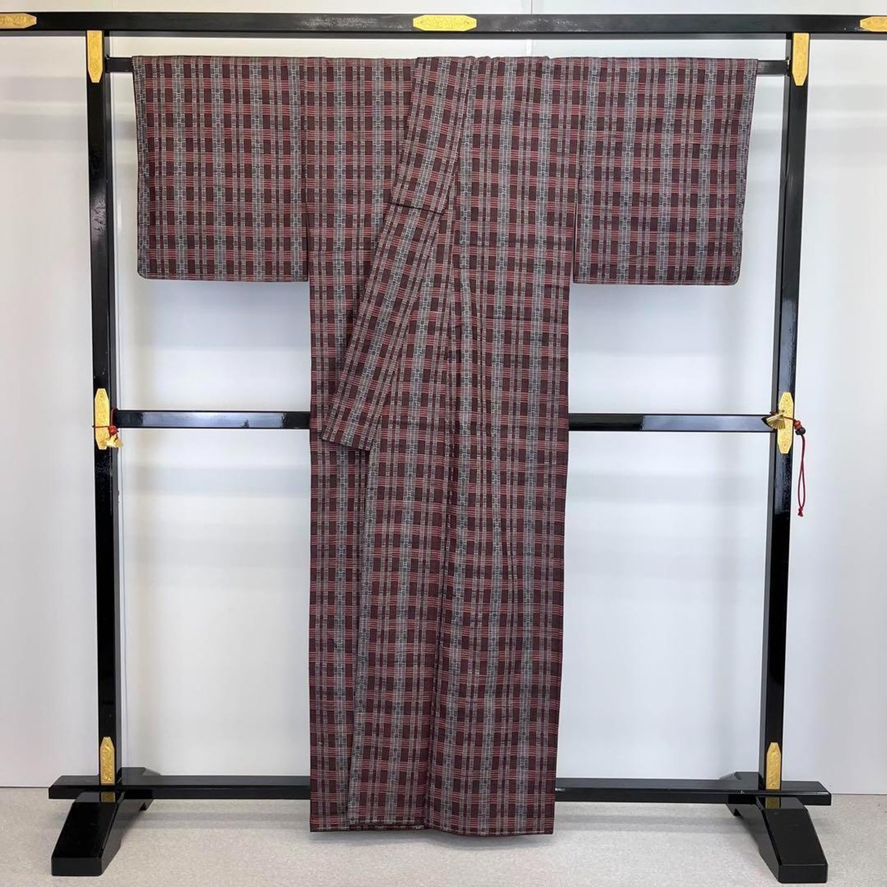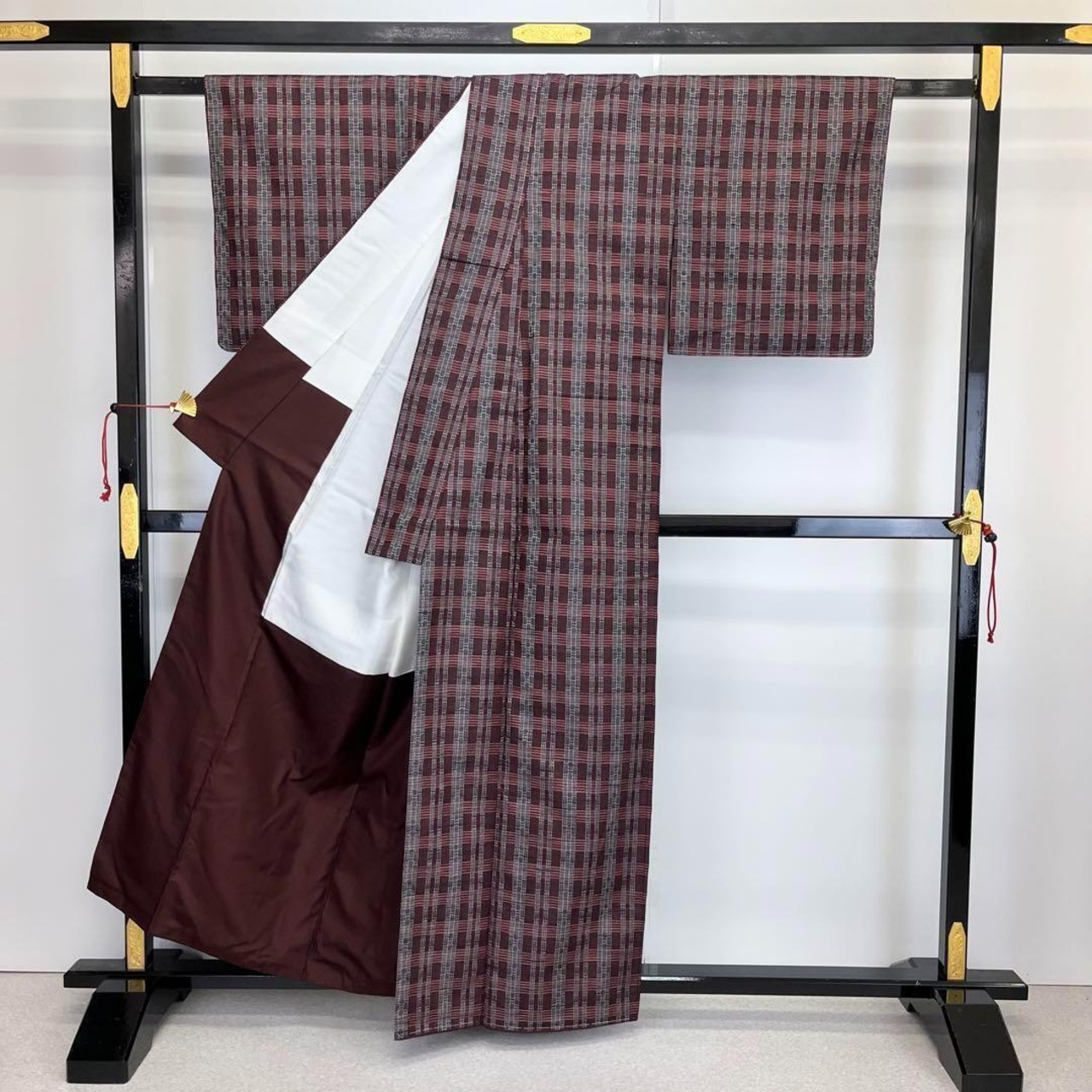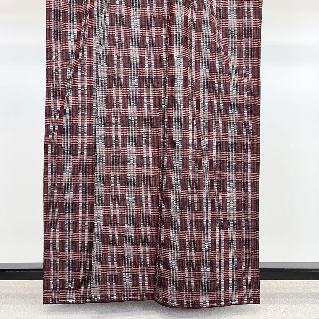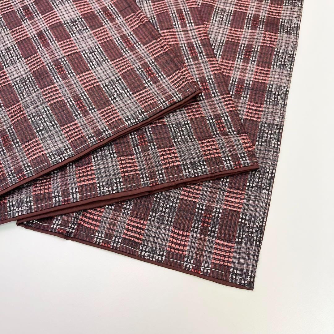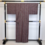 黒梅色の落ち着きのある赤味、格子柄に美しい花織でデザインされた素敵な柄裄のお品でございます。