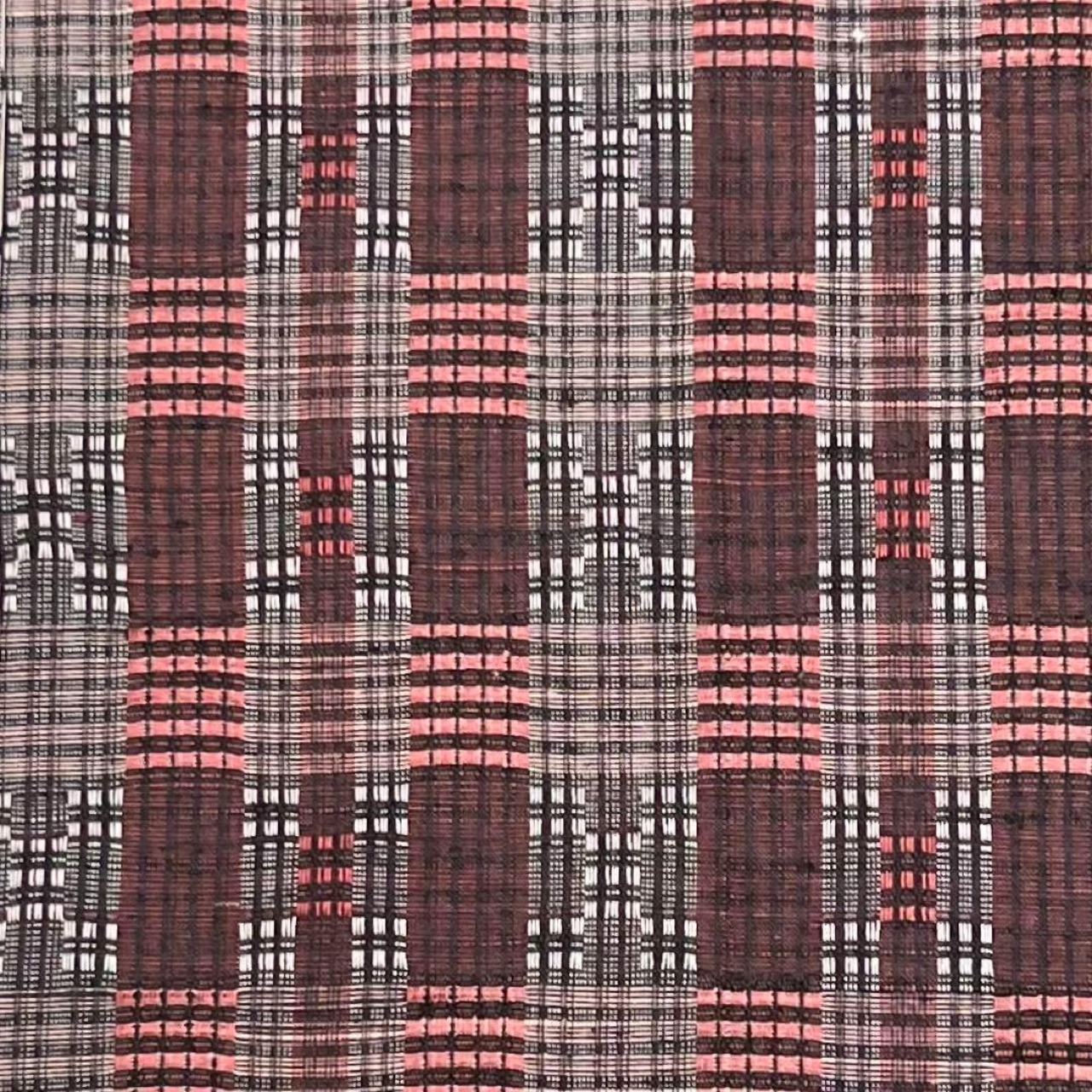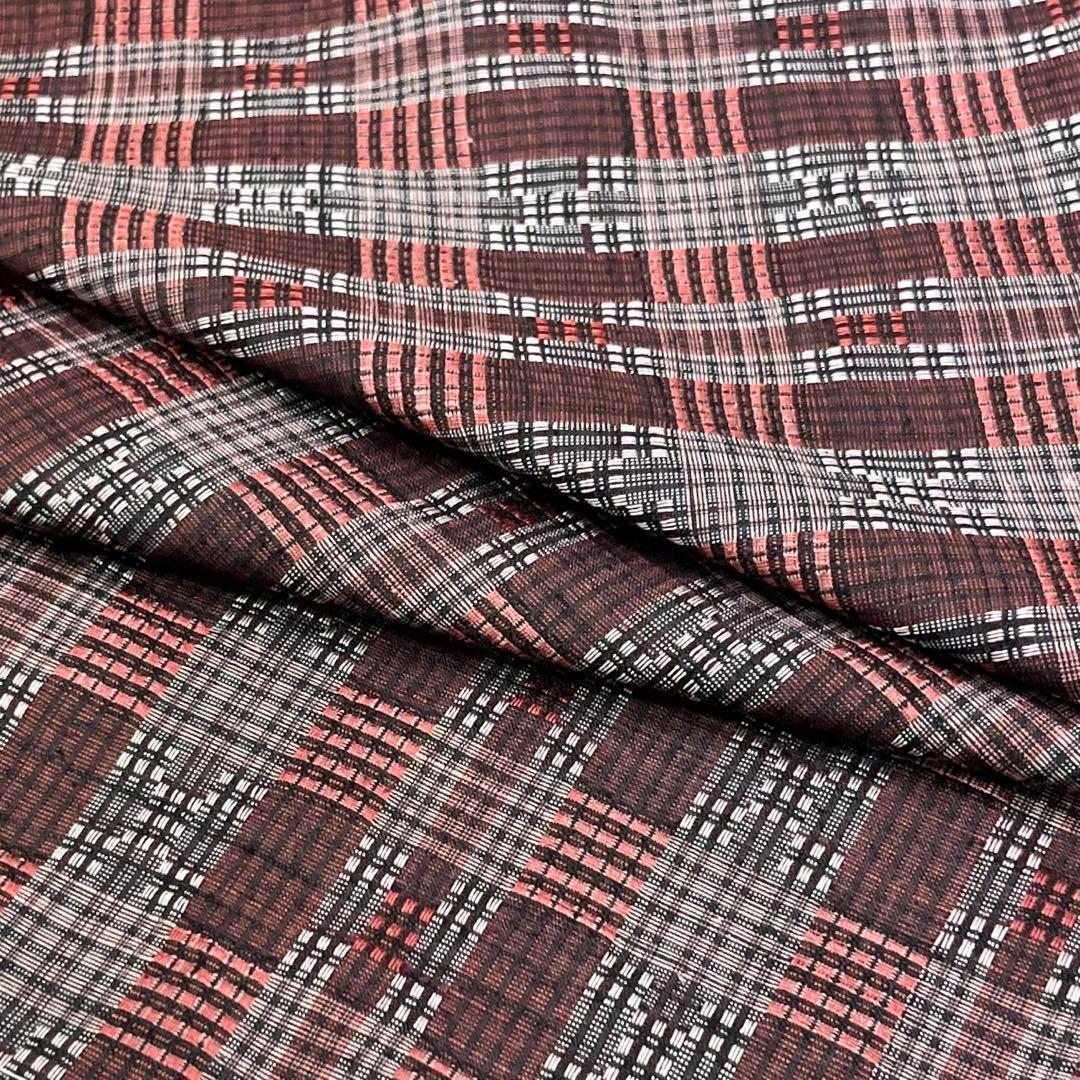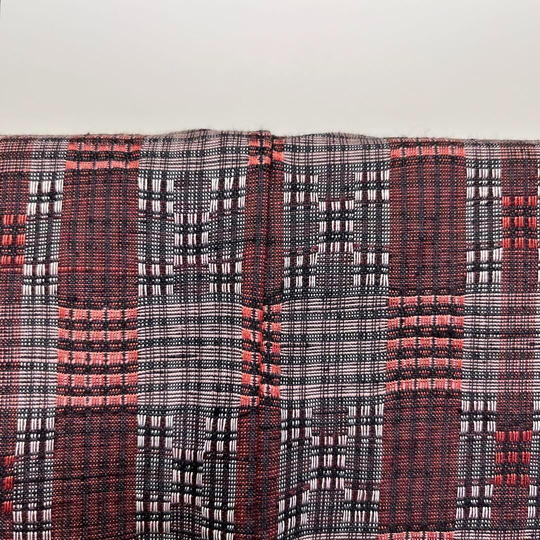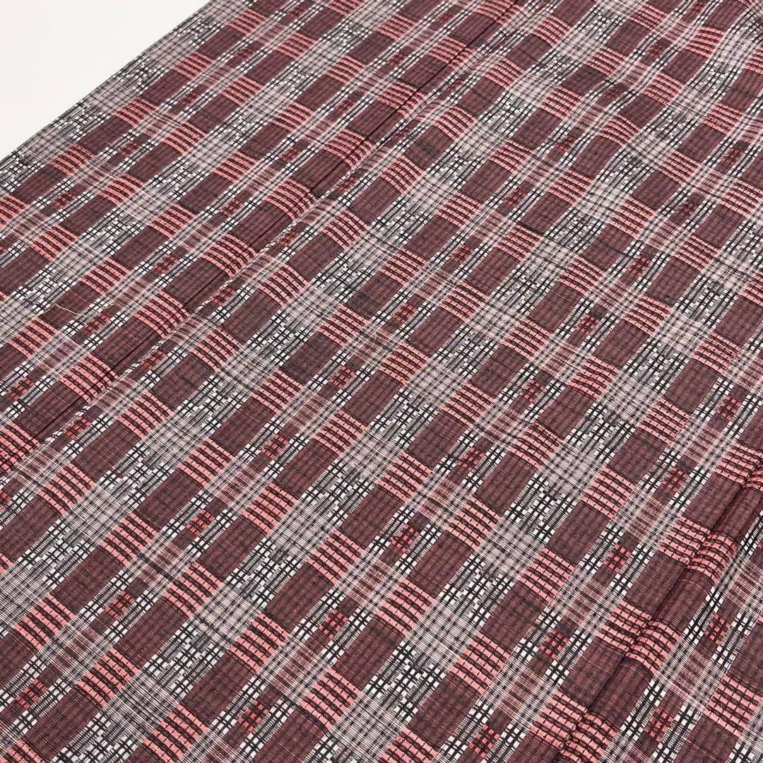 黒梅色の落ち着きのある赤味、格子柄に美しい花織でデザインされた素敵な柄裄のお品でございます。