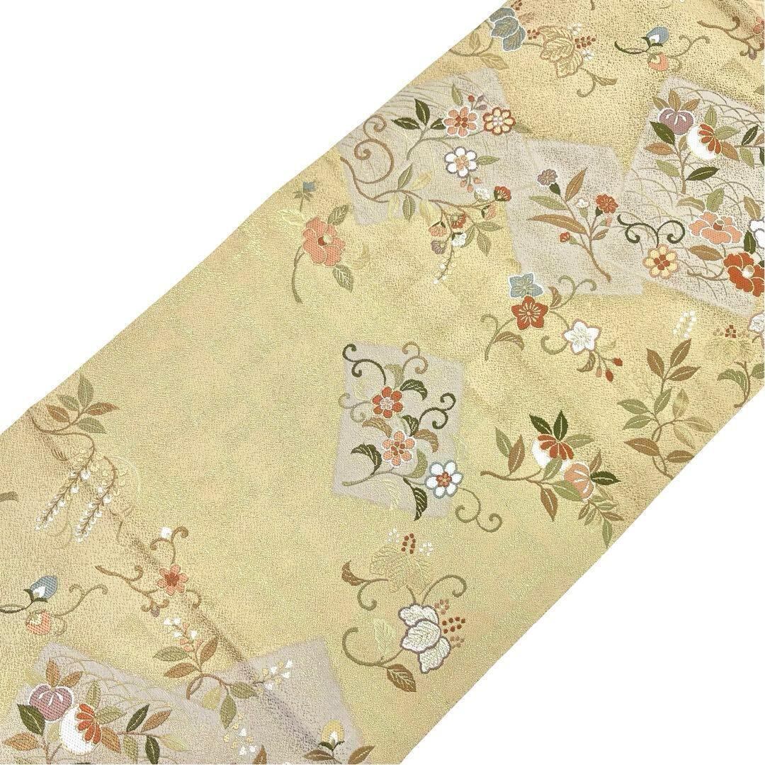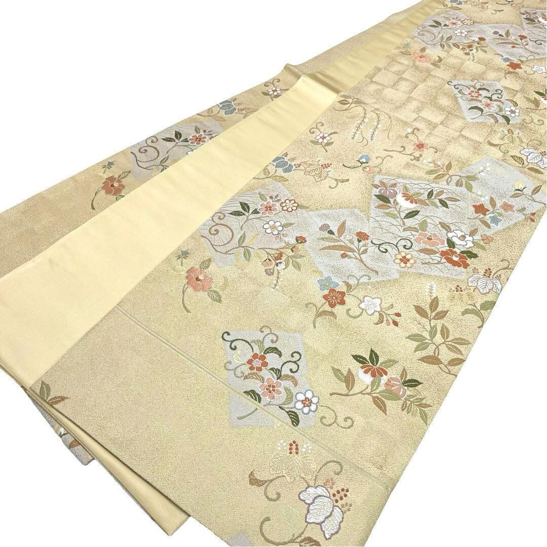 袋帯 色紙に花模様 金通し 麦藁色 O-3730 着物 きもの kimono 和服 和装 中古 リサイクル着物 【送料無料】