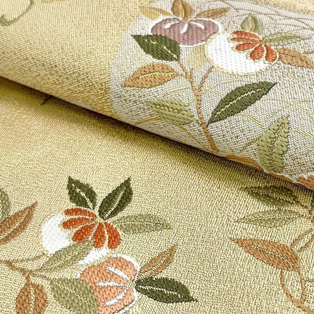 麦藁色ベースのお色味に金通し、色紙に多様な花模様の柄裄がデザインされた素敵なお品でございます。