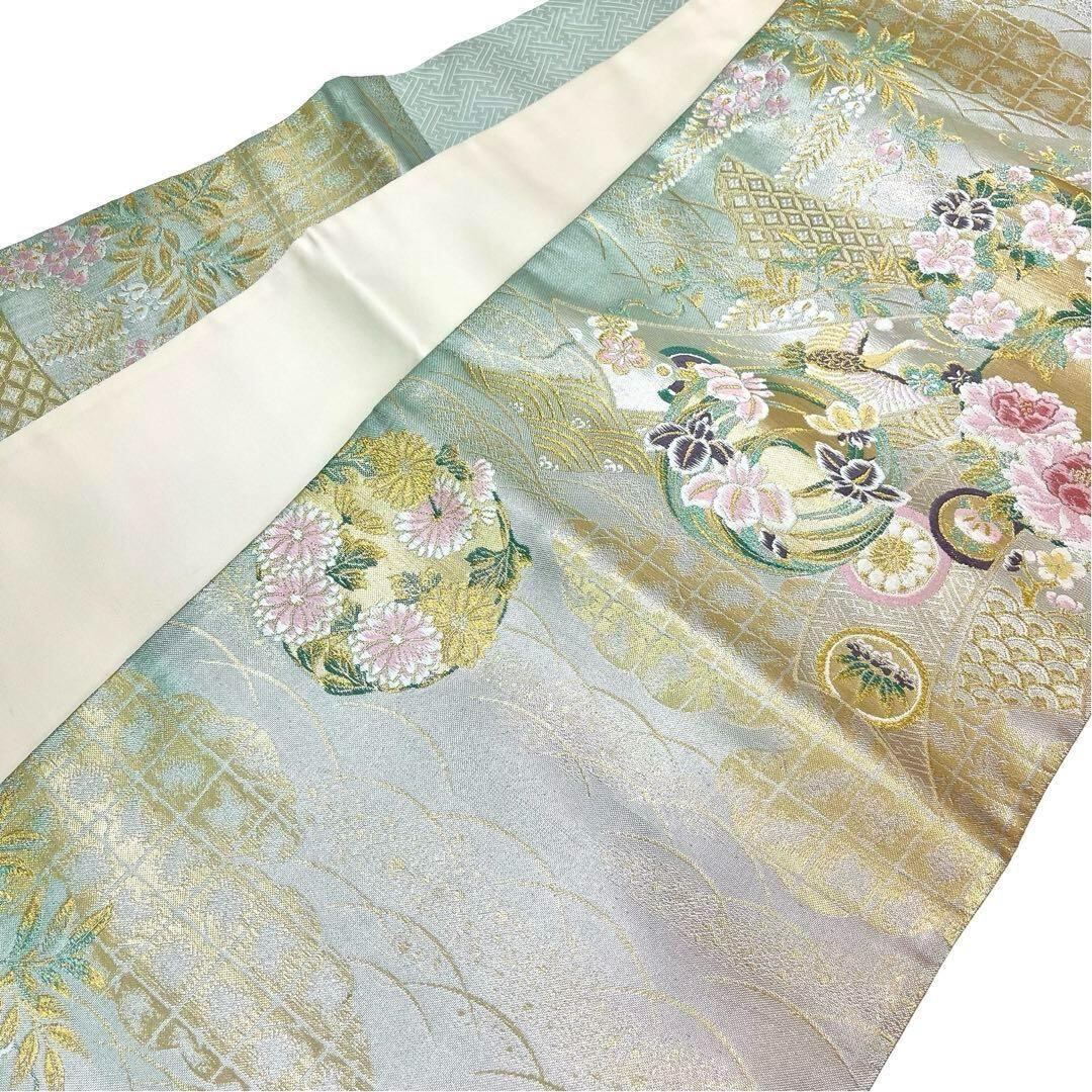 袋帯 鶴に美しい四季の花 金銀糸 白緑色 O-3698 着物 きもの kimono 和服 和装 中古 リサイクル着物 【送料無料】