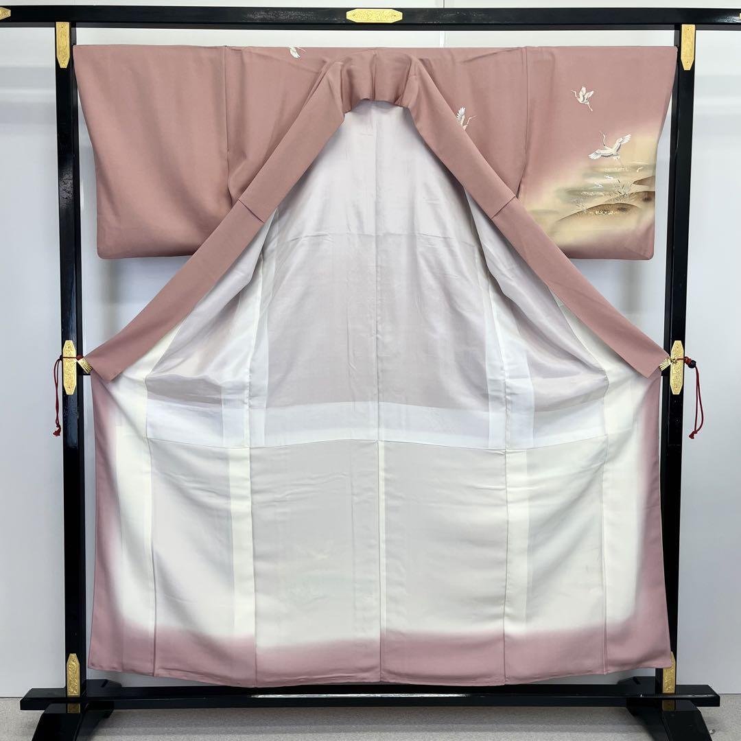 曙色の落ち着きのあるお色味に金銀彩が使われた友禅、波模様に飛翔鶴の柄裄が素敵なお品でございます。