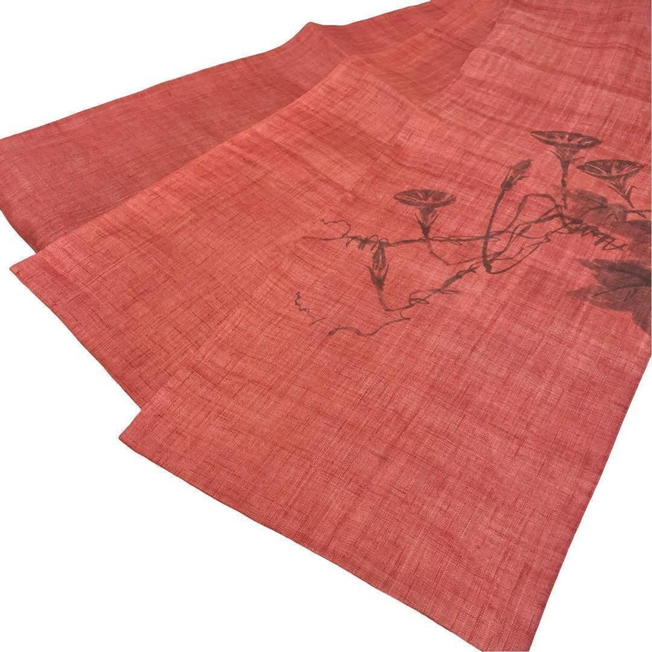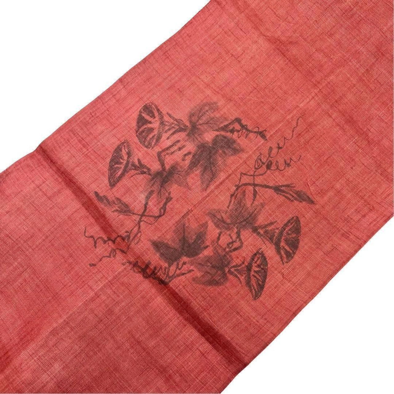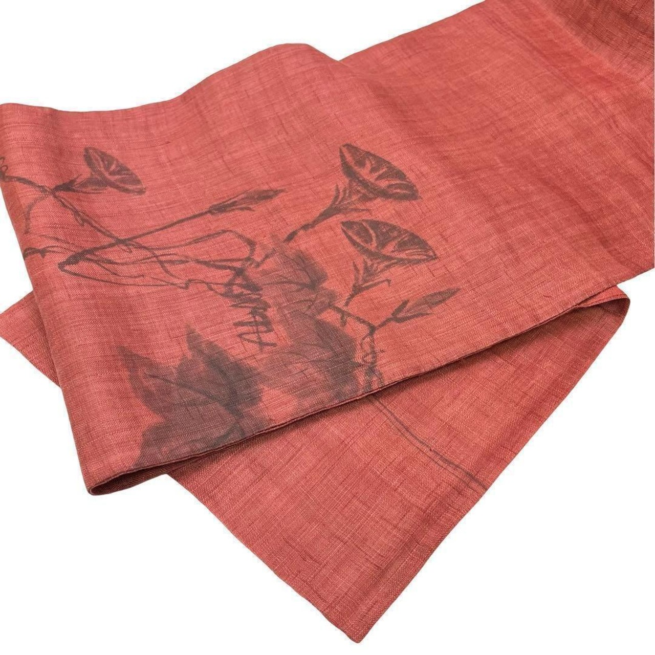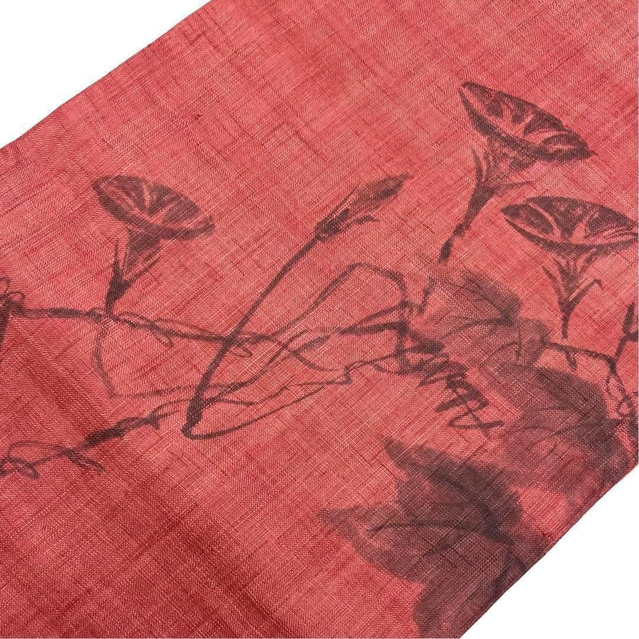夏帯 袋帯 麻 朝顔の花 墨描き 生臙脂色 O-3766