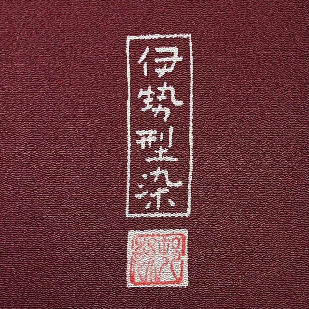 海老色の落ち着きのある縮緬に葉っぱに花模様がデザインされた伊勢型染の素敵なお品でございます。