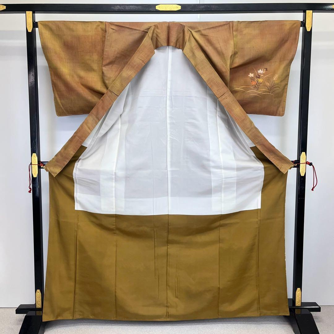 付下げ 紬 織の花模様 菊 萩 撫子 桔梗 松 暈し 肉柱色 K-3738 着物 きもの kimono 和服 和装 中古 リサイクル着物 【送料無料】