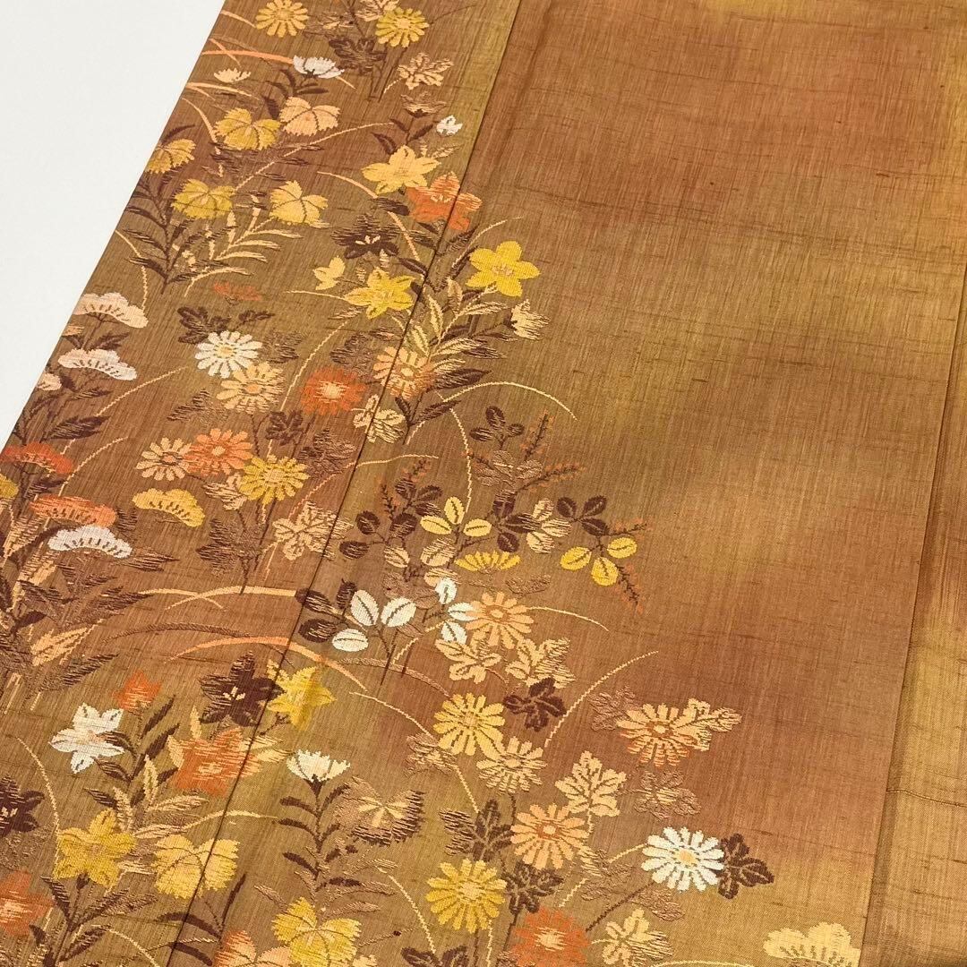 肉柱色ベースの暈しの紬地に菊、萩、撫子、桔梗、松などの織りの花模様がデザインされた雰囲気の良い素敵なお品でございます。