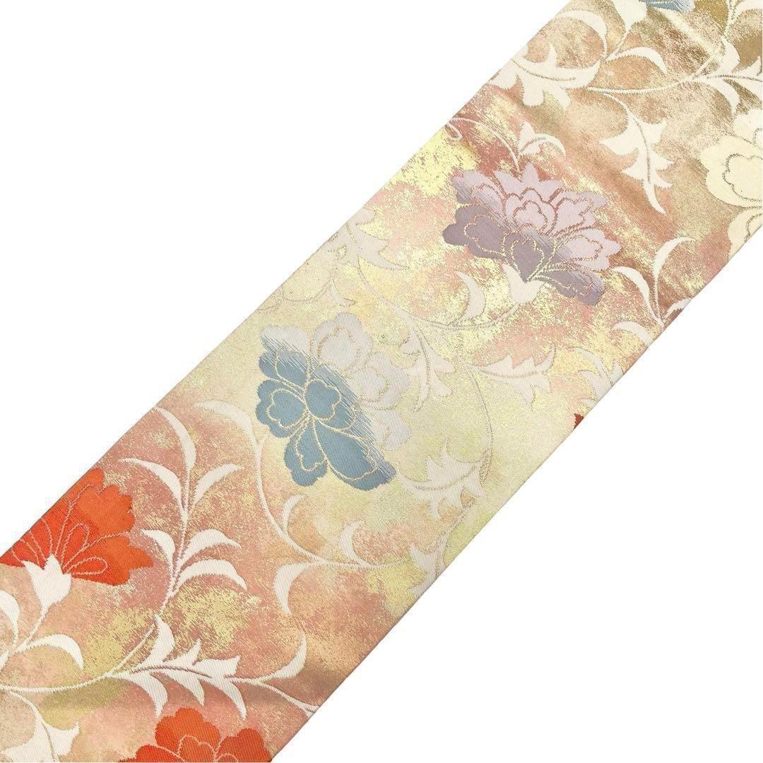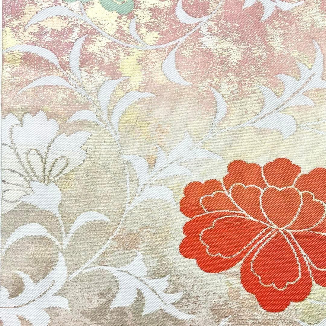 引箔、桃染色ベースのお色味に彩り鮮やかな花唐草模様がデザインされた素敵な柄裄のお品でございます。
