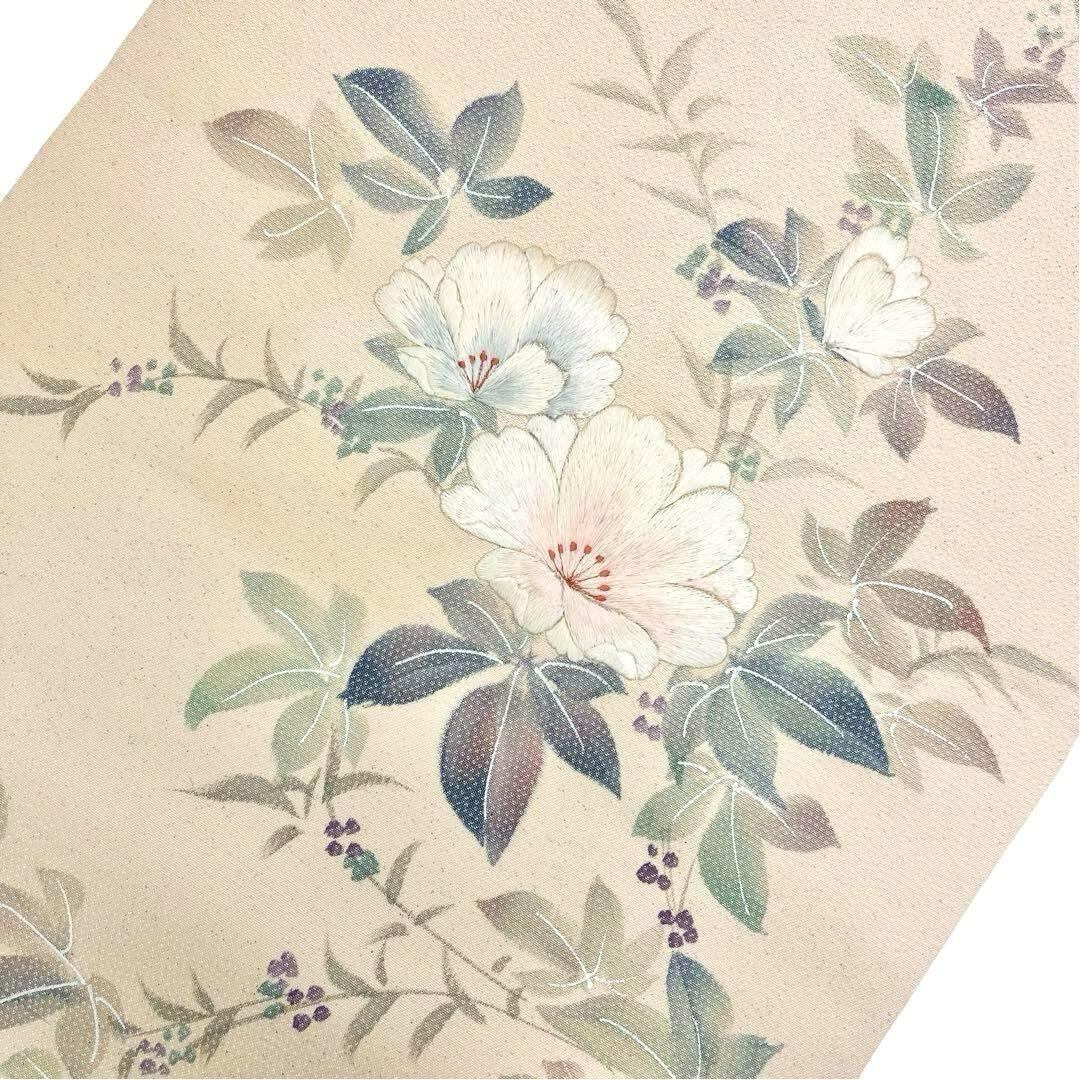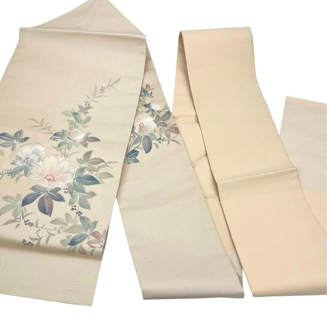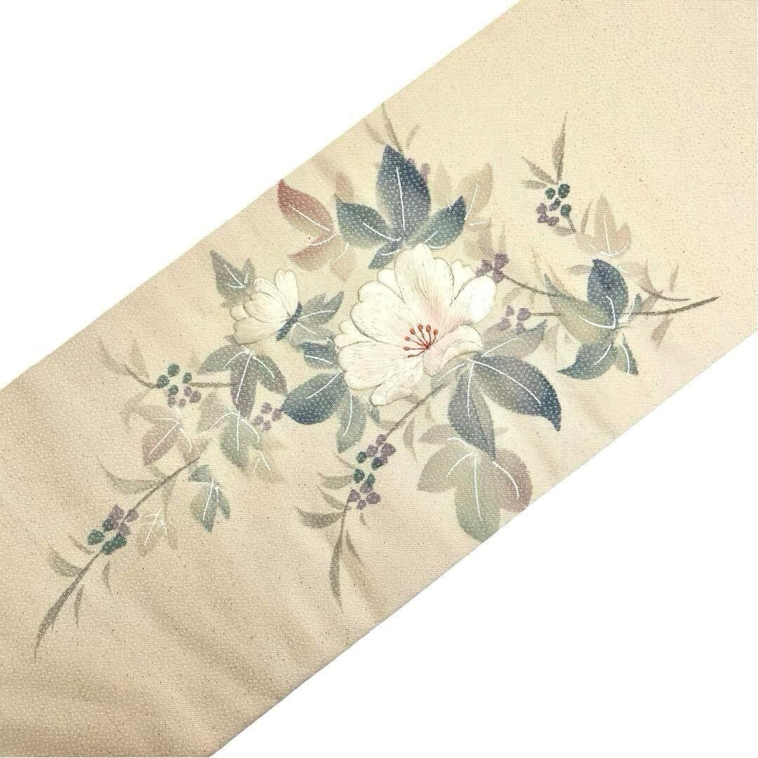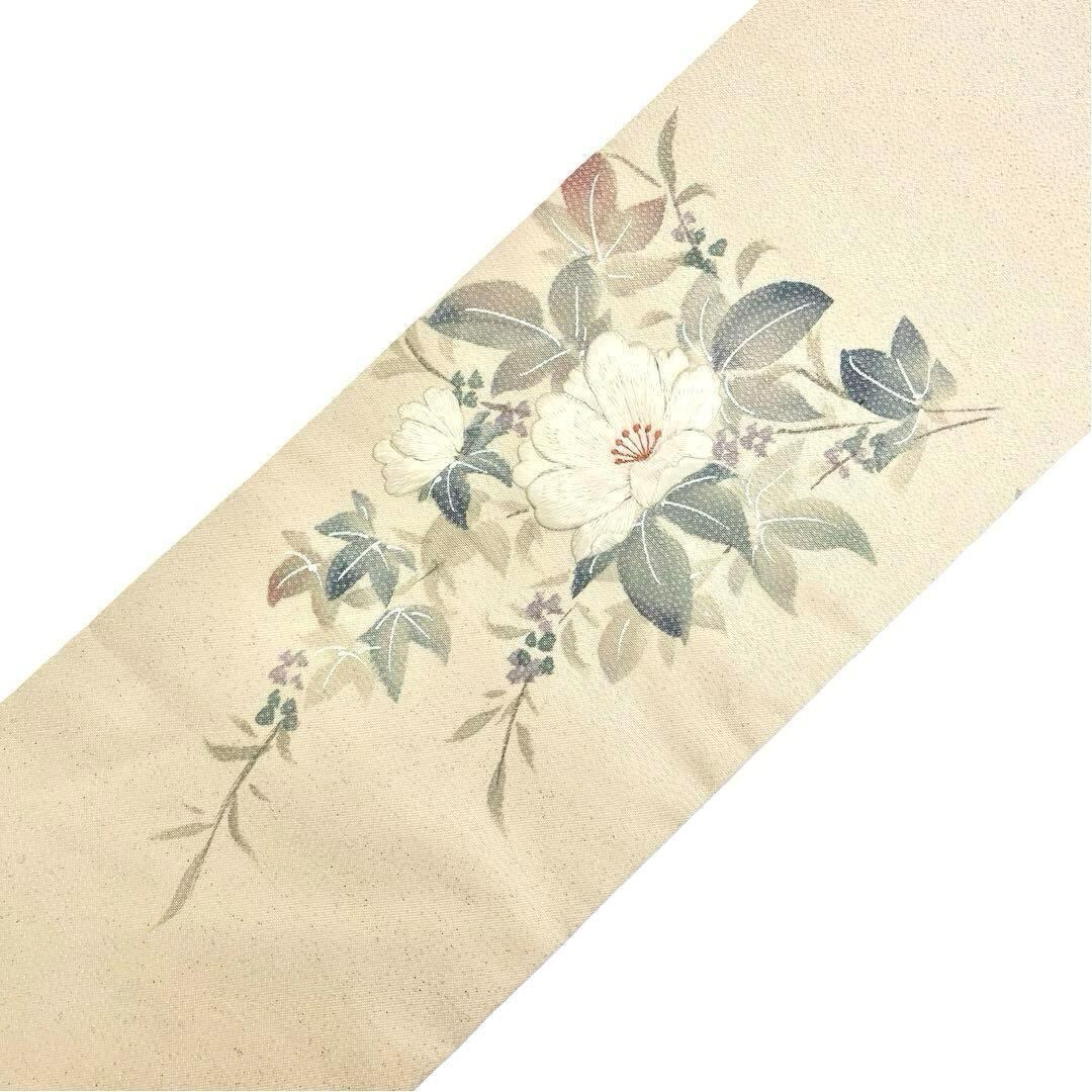 名古屋帯 白い花模様 刺繍 銀糸 鳥の子色 O-3770 着物 きもの kimono 和服 和装 中古 リサイクル着物 【送料無料】