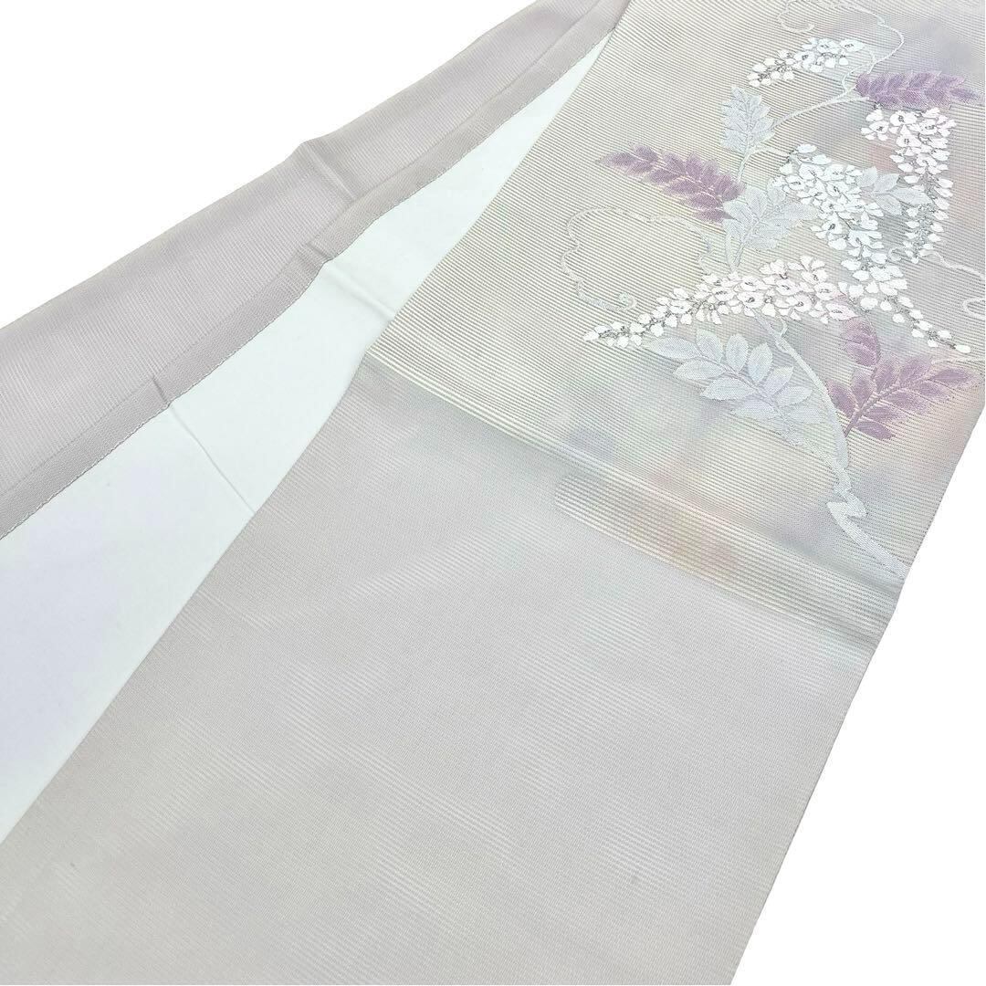 薄象牙色の上品なお色味に刺繍が使われた藤の花の品のある柄裄がデザインされた素敵な柄裄のお品でございます。