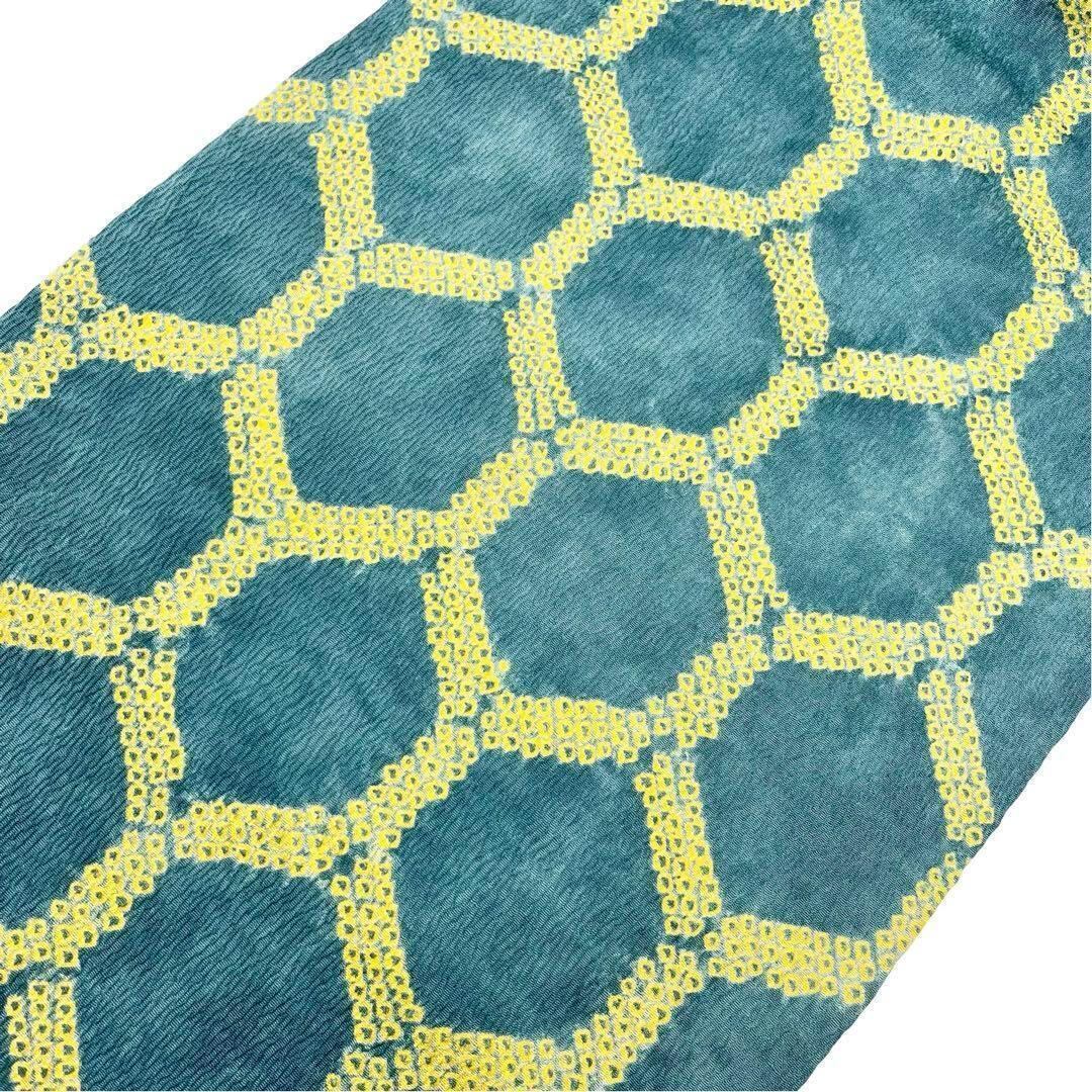 碧色の美しい染色に鹿の子絞りの亀甲柄がデザインされた素敵な柄裄のお品でございます。