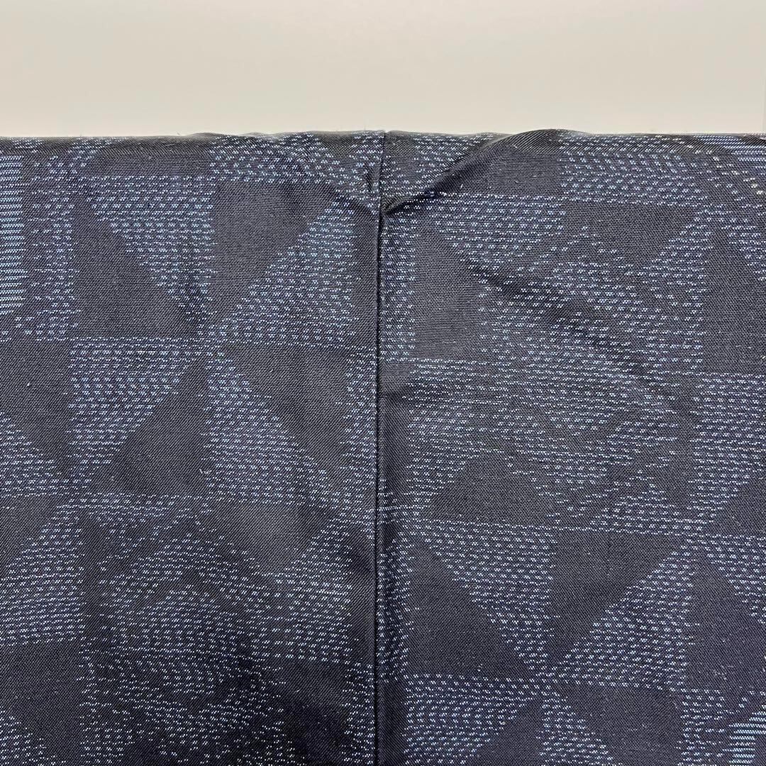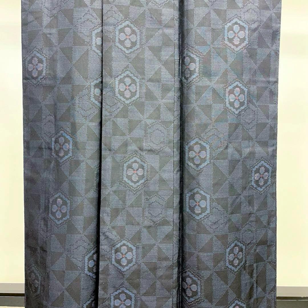 藍泥染の雰囲気の良いお色味、亀甲に花模様、風車のような柄がデザインされた素敵な柄裄のお品でございます。