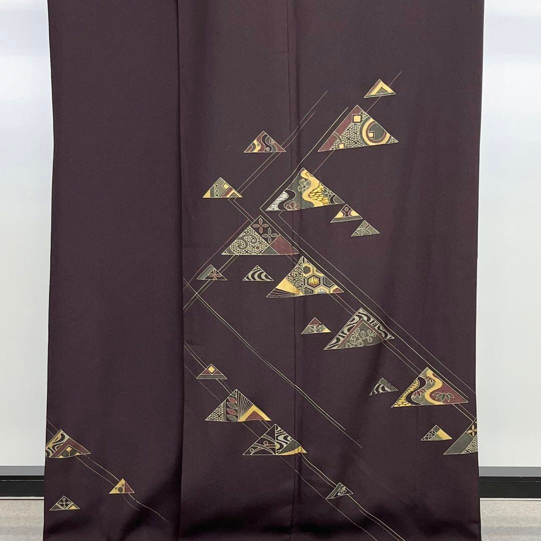 臙脂墨色の品なあるお色味に大小三角模様に多様な柄裄がデザインされた素敵なお品でございます。