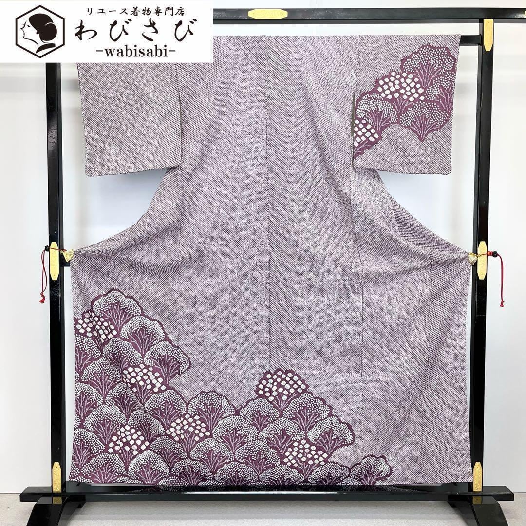 葡萄色の総絞り、疋田絞りのシボのしっかり立った絞りでデザインされた木々模様の素敵なお品でございます。