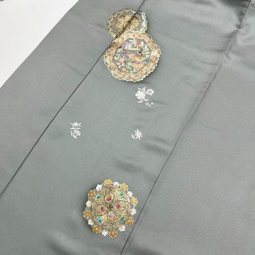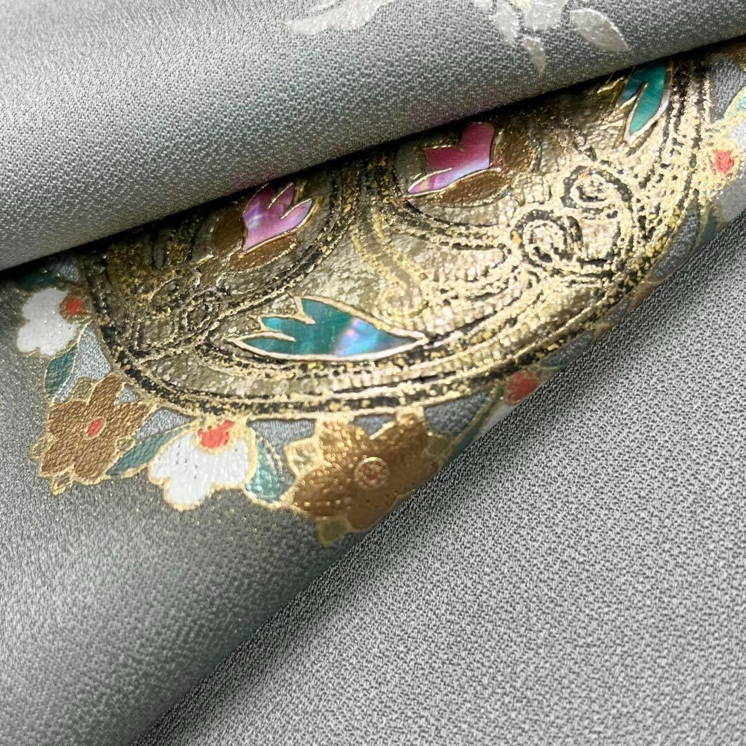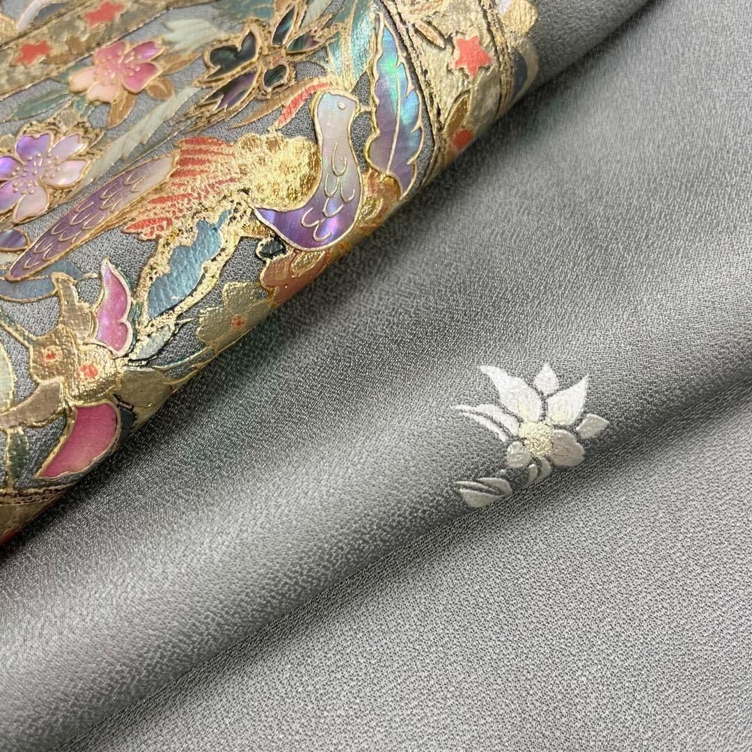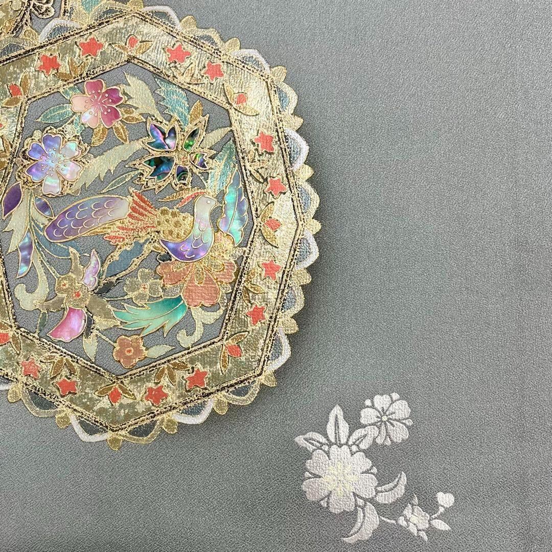 薄青鈍色の落ち着きのあるお色味に美しい金銀彩、螺鈿が使われた煌びやかな花柄に鳥模様の柄裄がデザインされた素敵なお品でございます。